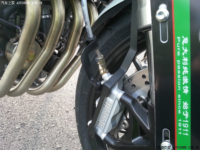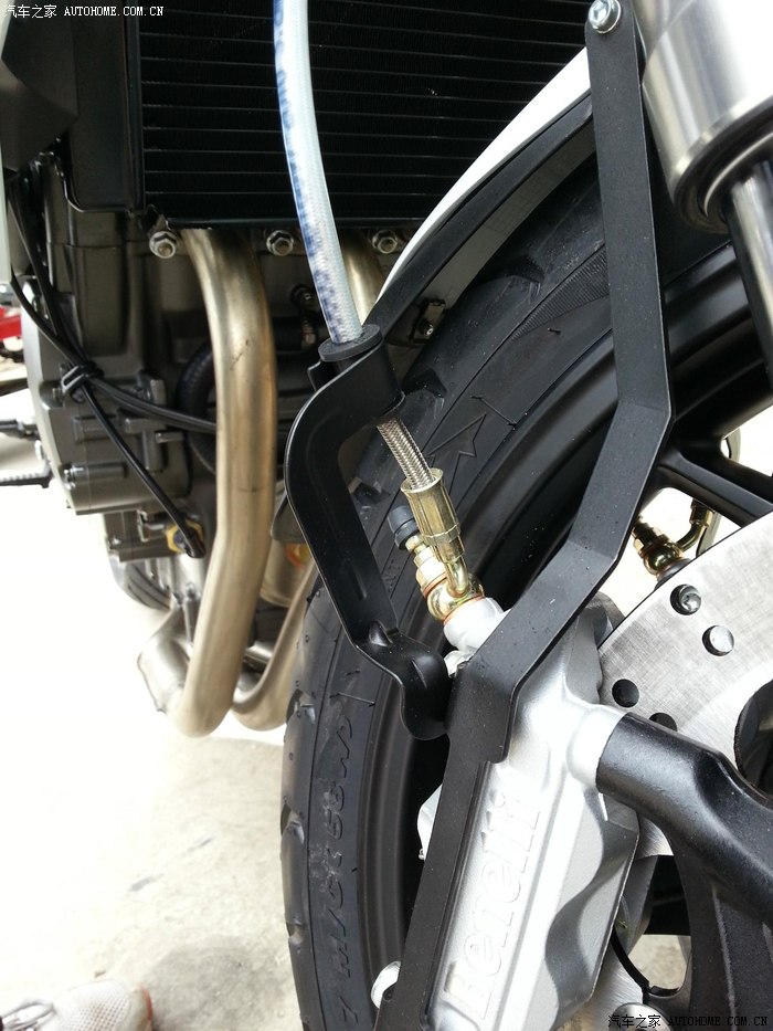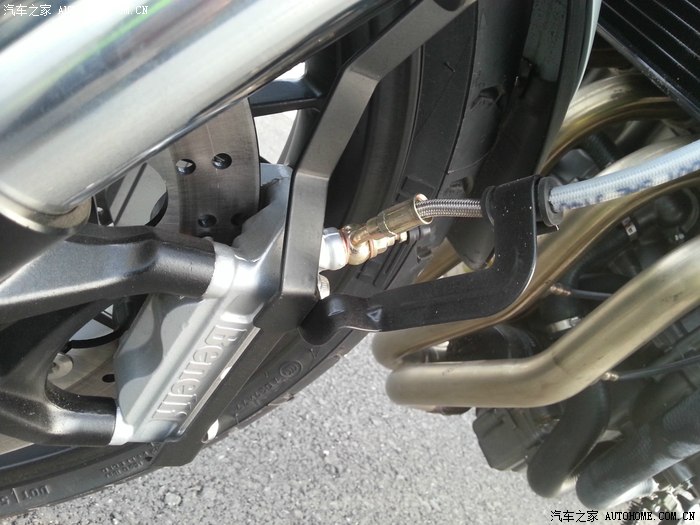 针对网上爆出的刹车油管爆裂,钱江做了改进,加了固定支架。悲催的是,7月份提车的淡水湖泊兄弟的车上没有这个小部件。