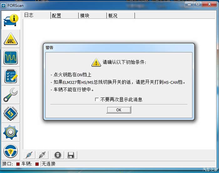 9.软件会提示你ELM327处于HS档位,点好开关要处于ON。此时不点击对话框的确定,然后把ELM327确认在HS档位,然后将点火钥匙处于ON位置(1.5的把钥匙拧到点火前一档,为防止刷机过程中出现断电情况,可以把车子处在发动状态)再点弹出对话框的确定。(假如软件连接过程出现终止,可以将软件设置成英文版本然后重启电脑,关闭所有杀毒软件,重新尝试连接)