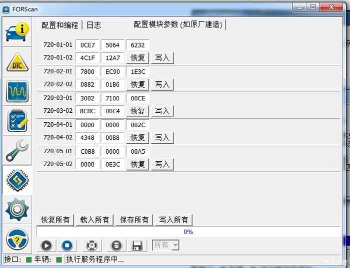 如果数据少你可以拍照,如果数据多的话你就需要借助forscan来备份了。备份按钮为保存所有,保存的文件类型为AB文件(下面我会提供AB文件读取软件),保存的内容只会是当前读取模块的内容,注意!看清楚你要更改的参数位置,写进去后点击写入就可以。然后重启你的汽车就成功了。