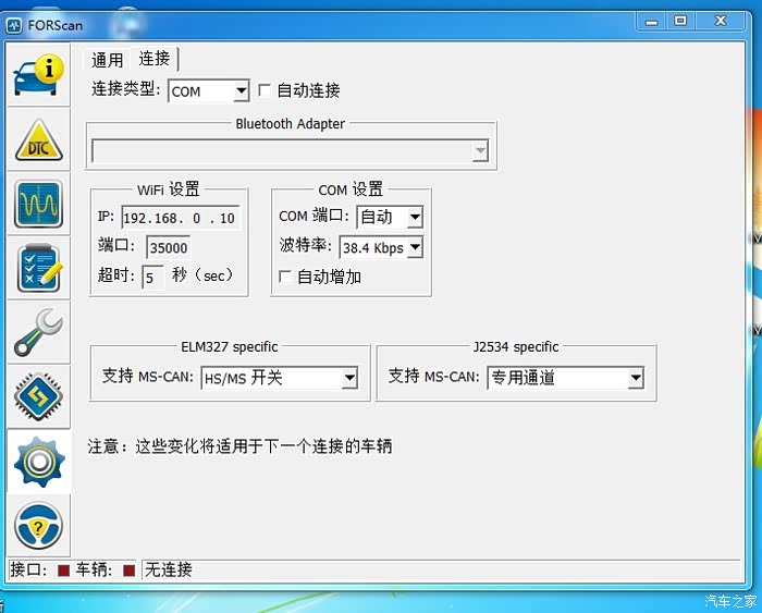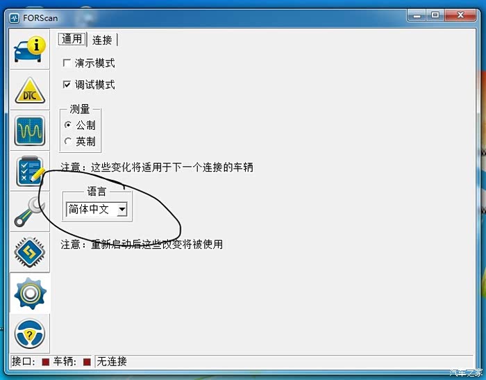 7.设置forscan,打开软件,点击左侧齿轮图标,可以设置成中文模式,重启软件后继续设置,点击通用边上的连接。继续设置软件参数。