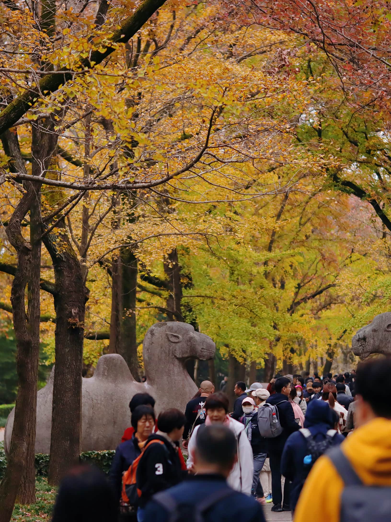 明孝陵的石象路上,沿途的游客踩着落叶,沙沙作响,周围的银杏已经开始变黄。