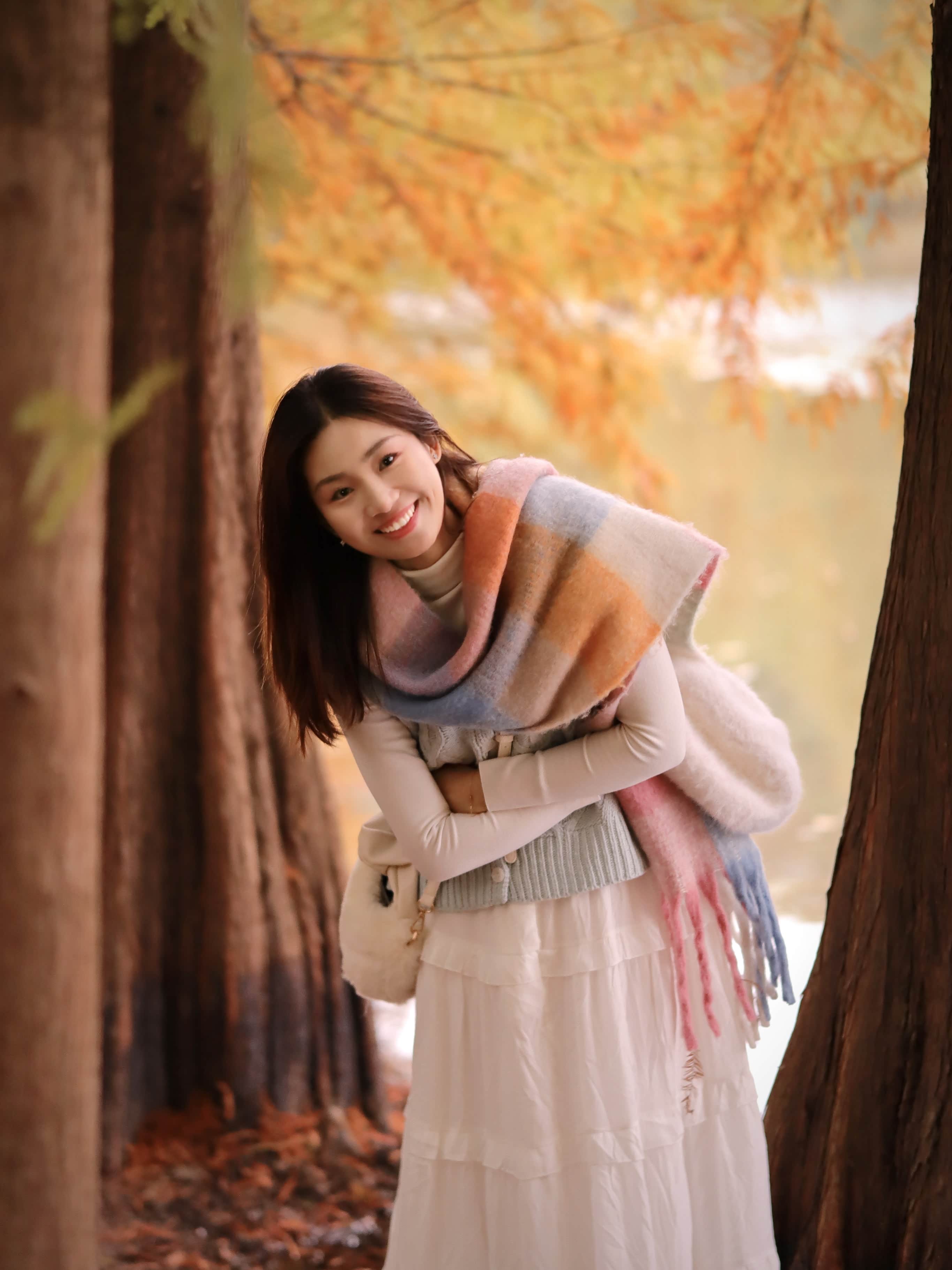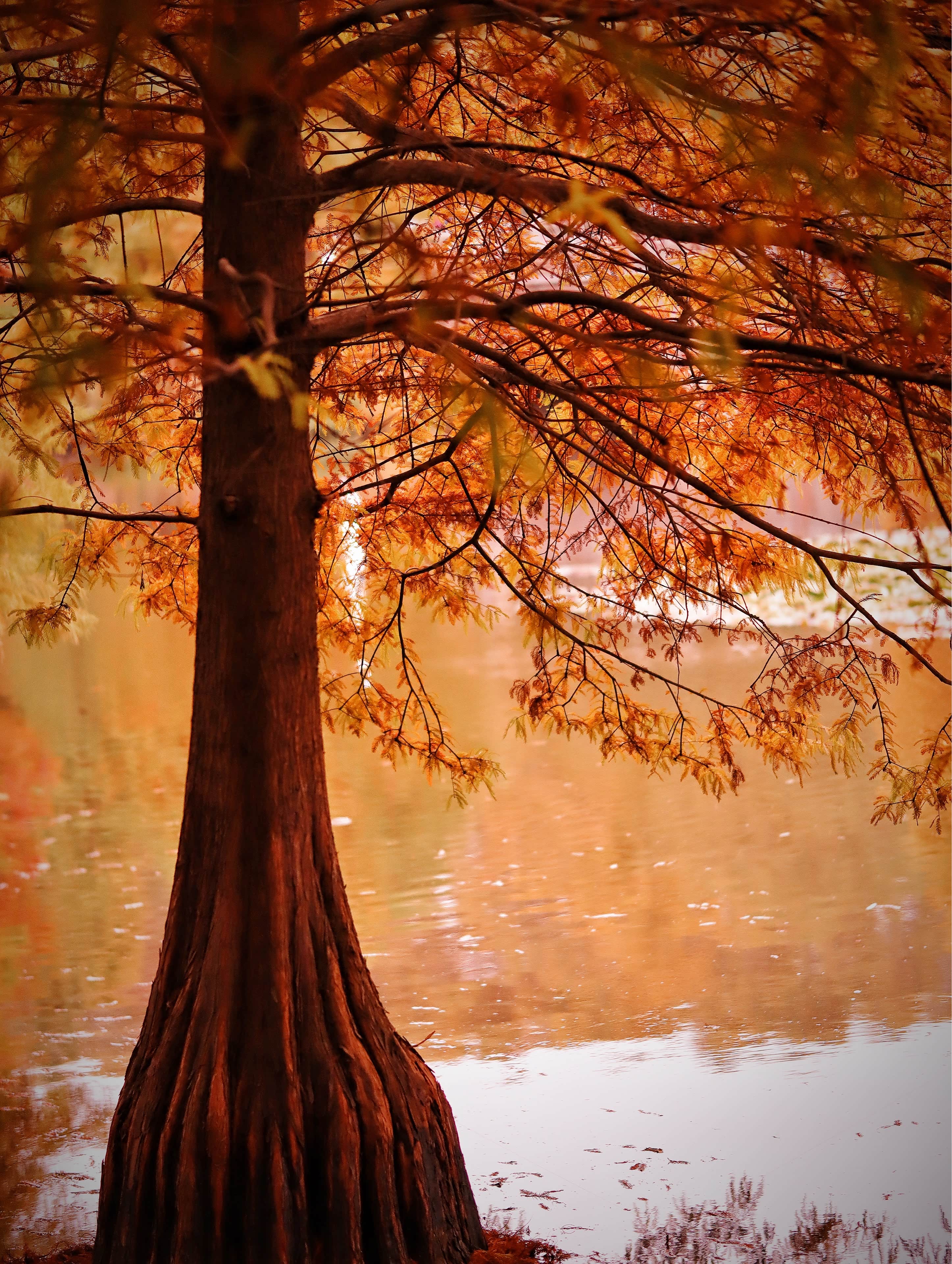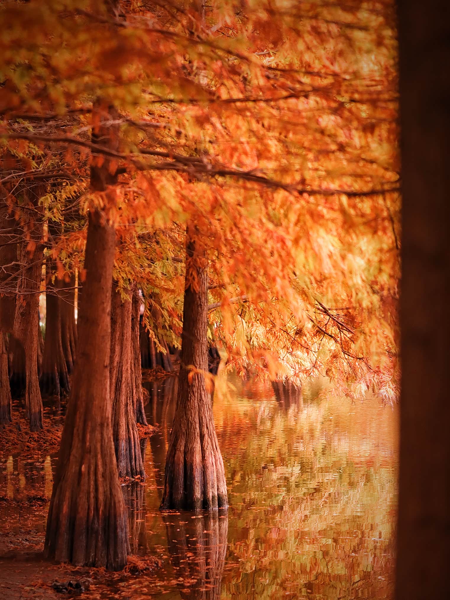 在燕雀湖,我见识到了落羽杉的美。焦糖、绯红倒映水中,像打翻的调色盘。沿栈道走着,随手一拍都是秋色。