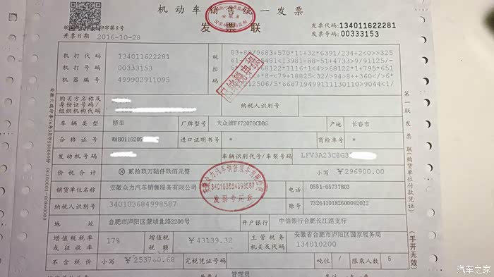 于是一切就在等待中,等发布、等上市、等参数、等价格。一直到7月27日发布会的到来,可以说期间的每一天都是度日如年,我已经中了迈腾的毒了。从发布、到参数价格公布,就已经决定,非旗舰不买,不考虑性价比、不考虑什么BBA、一切就一个词,我喜欢,于是又到跑遍了合肥所有4S店,看车、试驾,一直到10月11日,终于在安徽众力4S店敲定了最终细节,于是下定!在下定的过程中还有个细节,店里有一部凯撒金旗舰版,是厂家第一批到店的展车,因为颜色的原因,我还是偏向于黑色,所以放弃,10月11日下定,当天厂家配车,14日车到店,巧的是,车的生产日期就是我订车的10月11日,完全不用考虑库存车的风险。由于我的一系列工作原因,一直拖到10月28日才去店里提车,提车过程又是一系列手续,置换、贷款、保险等等。最终29日将车开走。我的大迈,我们上路了。