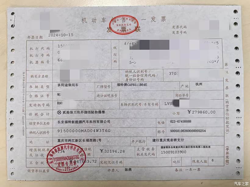 经过厂家一个周左右的内部审核流程,终于开完发票,车也从厂家运输到了表弟家那边的4S店。2024年10月15日开的发票,车也是刚生产的24款探险者昆仑版,一切都那么好。