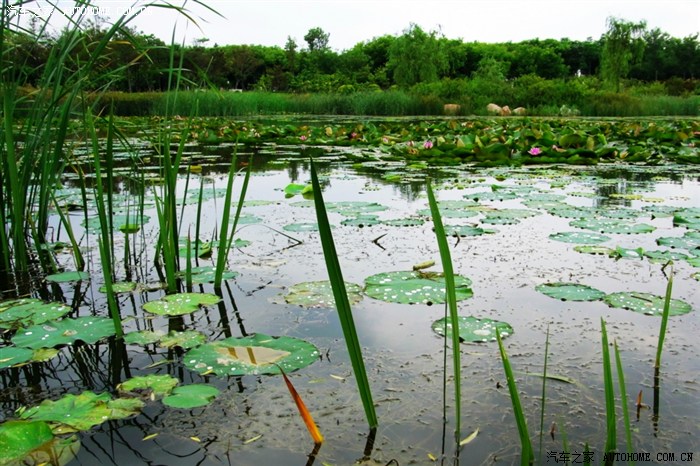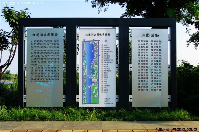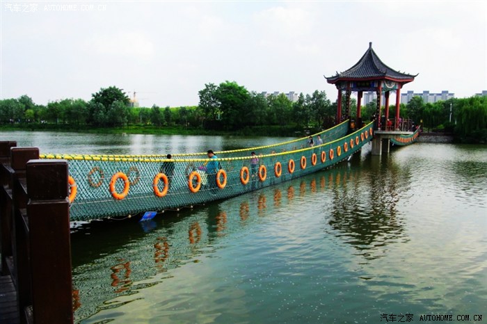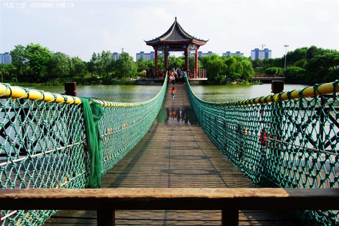 远眺红莲湖南岸、北岸,风光各异,一架吊桥,南北链接。