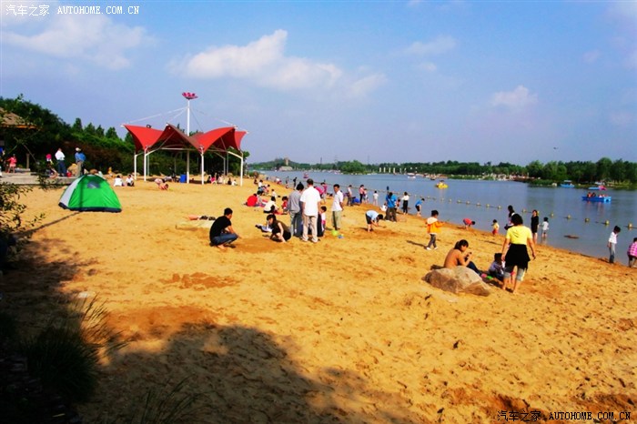 人造沙滩,尽管有些凉,孩子们还是很快乐的立在水中。边上的月季花接近枯萎,但仍不失美丽。
