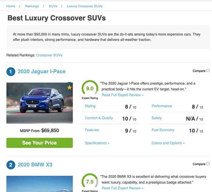 刚看到北美豪华suv的综合排名(车价4万美元以上已经属于豪华suv了