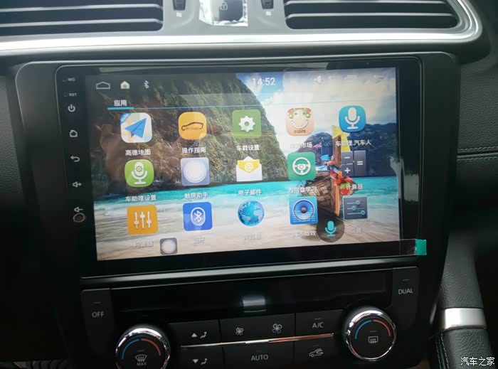大屏导航主页面有两页,这是第一页,功能比较多。好用。清晰度比较高。试着放过视频很清晰,声音很好,听歌不错哦。