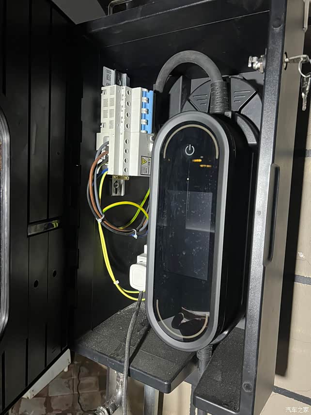 随后就是安装,这个盒子不大,但是足以放下三相电的漏保开关,这样就可以把漏保的盒子隐藏起来,更加美观,我还接一个220V电源,以备不时之需。把边框也喷黑了,为了和纯正的奥迪e-tron原配充电桩完全一样