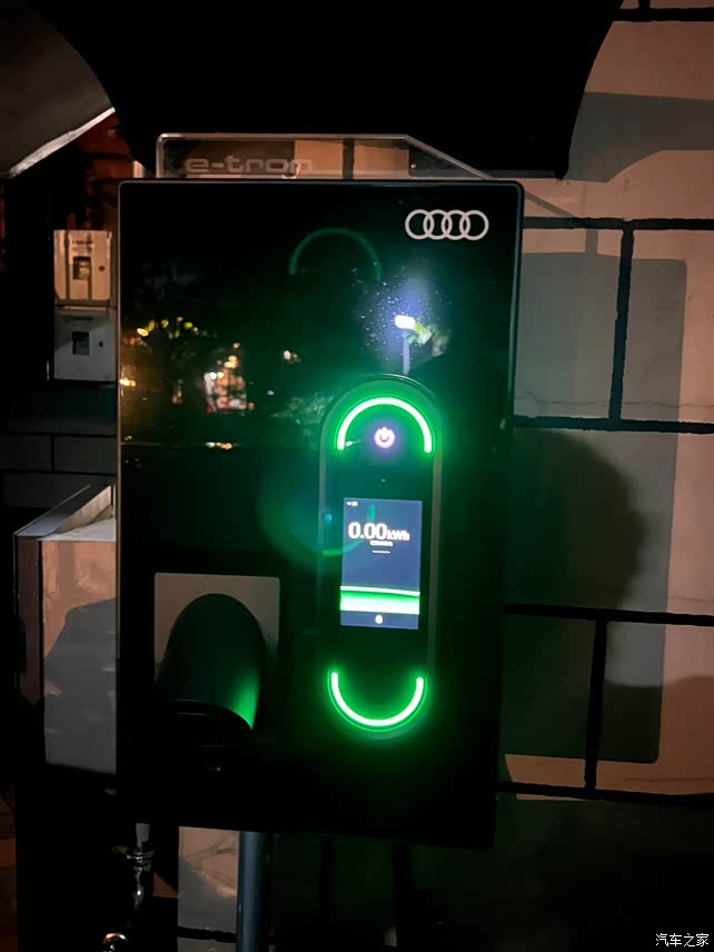 安装好后的效果真是太赞了,感觉整个车的档次都提高了,让我的e-tron回到了七八十万的档次😂,充电桩的内部系统虽然是保时捷的,但和奥迪的22kw充电桩唯一的区别就是开机动画是Porsche而不是四环😝可能会露馅,但是内部界面是完全一样的,和奥迪没有任何区别!晚上亮起绿光特别好看!