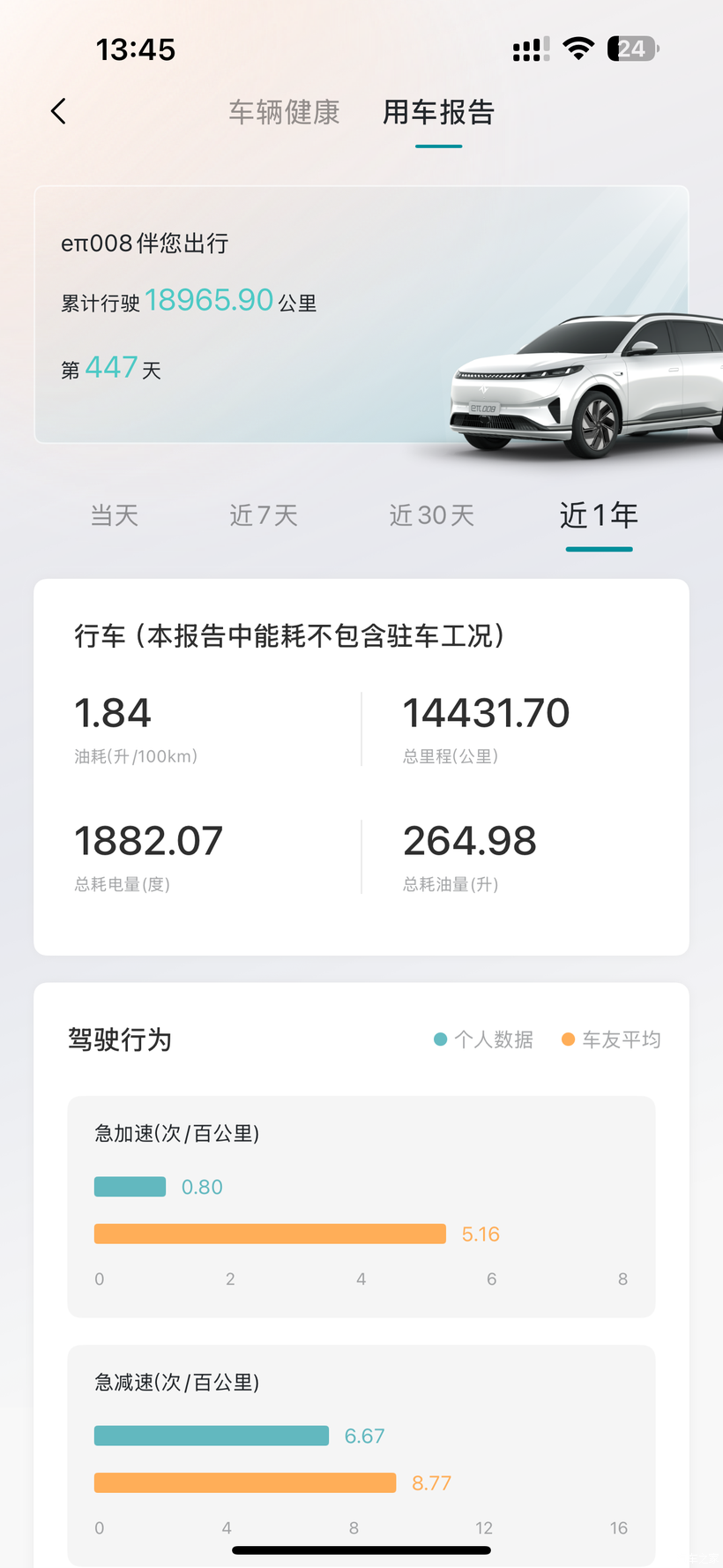 最让我满意的,莫过于能耗。 报告上近一年的油耗显示为 1.84升/百公里,总里程14431公里,总共也就用了264.98升油,但电却用了1882度。明眼人一看就懂,我这绝大多数时间都是在用电跑。平时市区通勤、接送孩子,基本就是纯电模式,家里车位装了充电桩,晚上预约谷电充电,每公里的成本也就几分钱,跟之前开的油车比,开销简直是一个天上一个地下。只有节假日跑长途回老家或者自驾游的时候,才会用到增程器。这个油耗数据,对于这么大一台车来说,我是非常满意的。