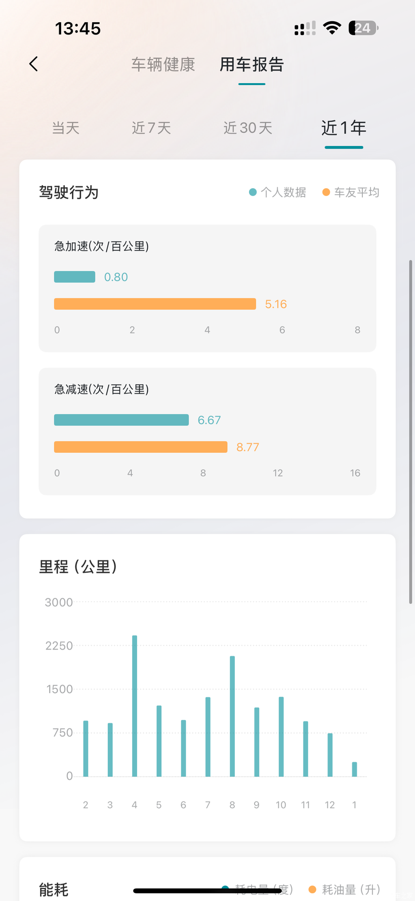 驾驶行为方面,我好像还挺“温和”。 报告显示,我平均每百公里急加速只有0.8次,远低于车友平均的5.16次;急减速6.67次,也低于平均的8.77次。老婆常说我这人开车“肉”,没想到数据还真印证了。不过我倒是觉得,开这车本来心就静,电车那种平顺、安静的劲儿,让你不自觉就不会去激烈驾驶,安全又省电,何乐而不为呢?