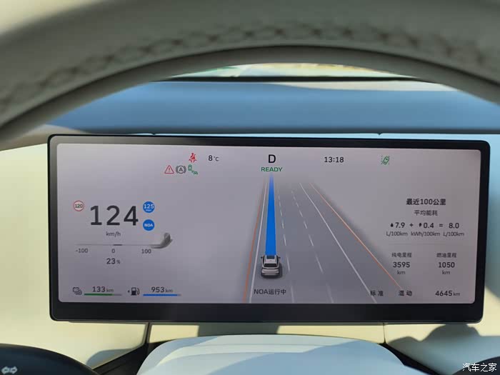 回家里程300公里,正巧给大家分享真实油耗,我开的是混动模式、动力模式是标准、动力回收弱,空调座椅加热功能全开、气温大概七八度、全程定速125km,基本上没有堵车顶着限速跑,油耗8个油。