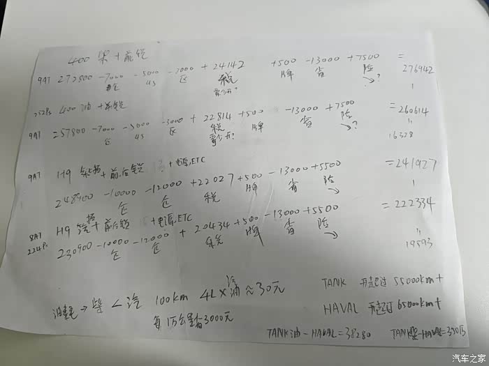 都试驾以后回家纠结开始了,是买H9的中配选前后锁➕etc➕后备厢电源还是买400燃油➕前锁。(这种选法两者配置几乎相同)。是买汽油版还是柴油版,我专门草拟了一个对比表单结合两个品牌的3月的销售实际力度,形成了这个价格表。