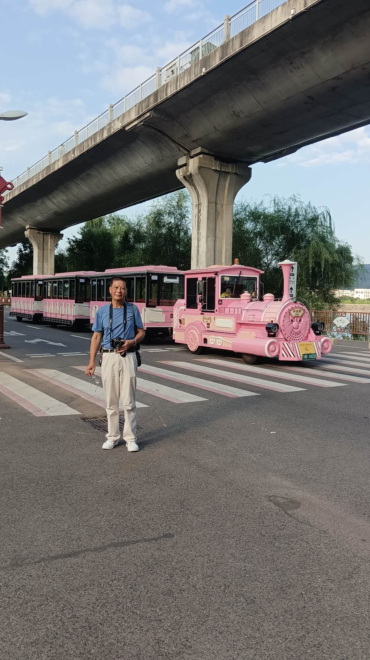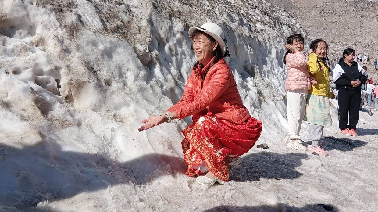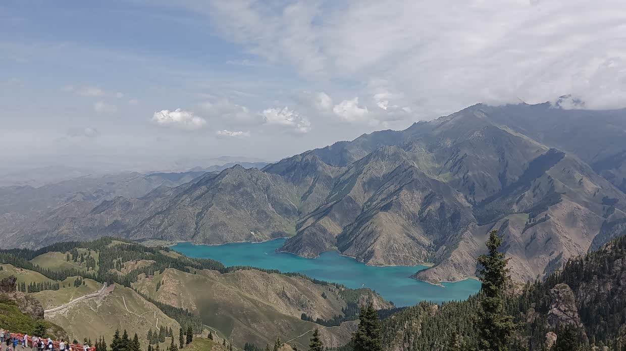 7月22日:今天去天山天池。几十公里的路程,早早就到了天山天池景区,好大的停车场。值得一提的是新疆基本上停车是不收费的,包括景区都是免费停车,只有喀什收停车费。新疆所有的景区对65岁以上的人免门票,但交通费用不免,60岁至64岁享受半票。天山天池景区我是免门票,太太半票,两人总费用大137.50。坐摆渡车上山,先到民族风情街,实际上是个商业街。上到天池可见一大湖景,实话说并不怎样,天池那的温度显示是16度。从天池那还可以继续坐车上山,但价格却很贵,两人要330元。山上的温度很低,可见雪山。说实话对于我们来自南方的广东,这天山天池景色真的很一般般,从某种程度来说还不如肇庆的鼎湖。哈哈!从天山下来,就转去阜康市。到了阜康市里,想吃米饭,已好久没吃米饭了。结果找了好多家都没米饭吃,最后找了家说有米饭吃的饭店,要了只大盘芦花鸡,结果上来一看失望了,大盘鸡内有一起煮的馕片,又没饭吃,一只鸡两人都没吃完,打包回酒店,明早煮面条吃。可怜!酒店的老板很热情,坐下一起聊了许久。