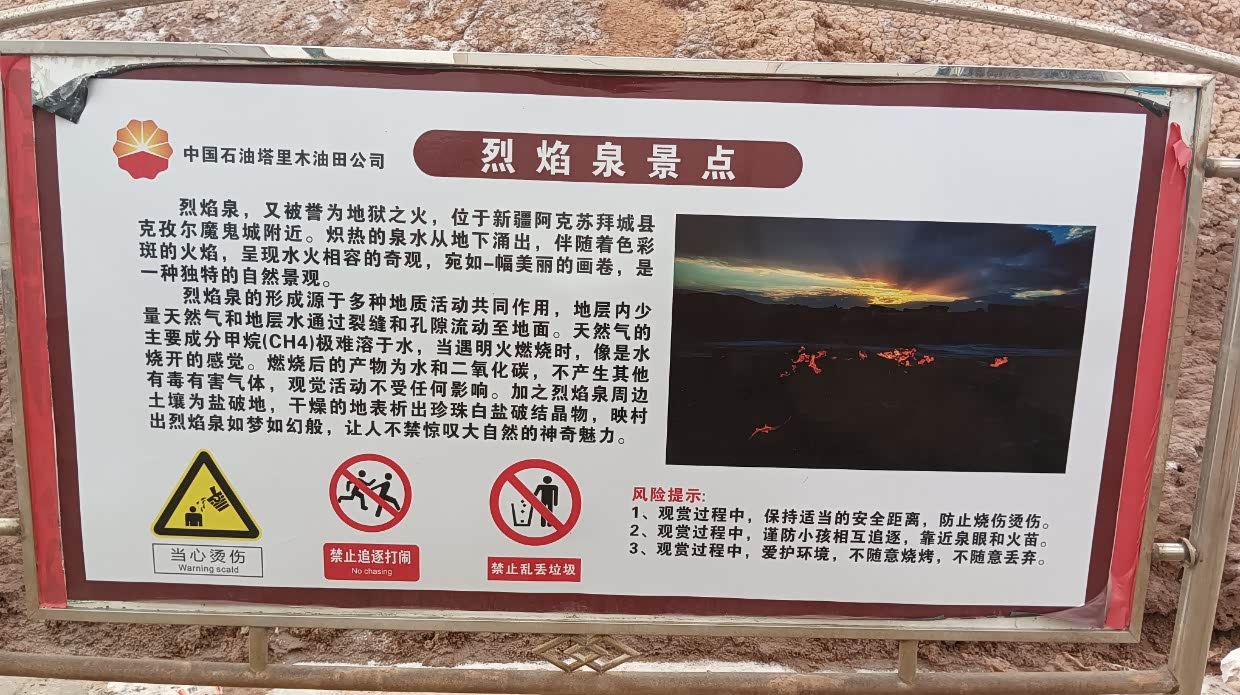 8月10日:出发去地焰火,十点就到了,不多人,只有五六台车。奇妙的地焰火是在水中燃烧。周围是魔鬼城地貌,各种各样的形状。玩的挺开心的。然后向温宿进发。下午四点到达。去了温宿古城玩。