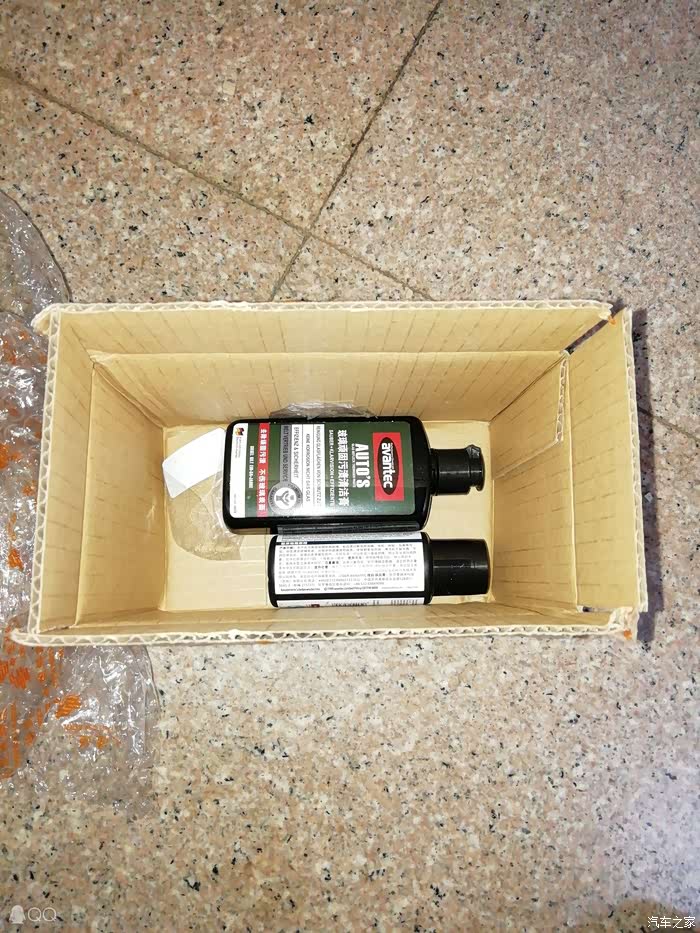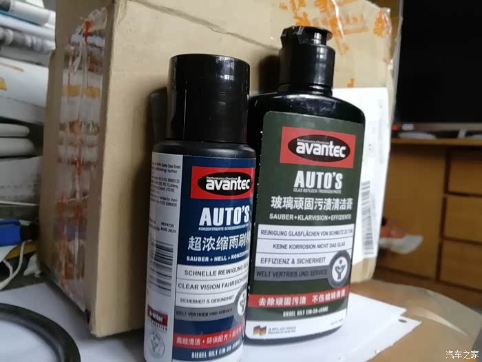 打开盒子就这两样东西,很简单的两个小瓶子,稍大点的是 汽车玻璃清洁油膜去除剂,小瓶是超浓缩雨刷精。