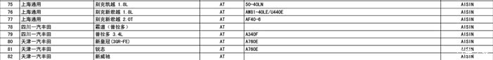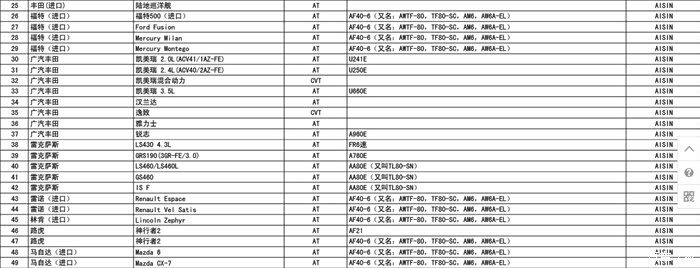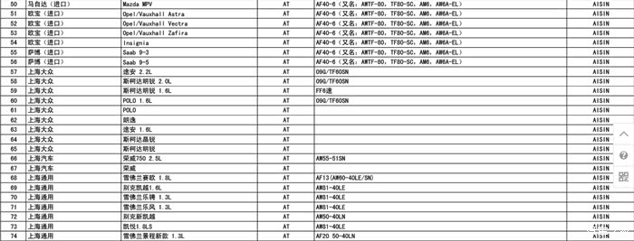 爱信变速箱型号大全,配套车型,与大家一起分享!版主求加精!自动变速箱AT大扭矩容量FR8速AT(TL-80SN)与高输出发动机搭配,同时达到卓越的行驶性和低油耗实现了与高档车相应的静音性和变速性能通过一体型外壳(变距器壳体和变速箱延伸壳体)达到轻量化搭载车型:雷克萨斯LS460、大众途锐、保时捷新卡宴Turbo、2010款保时捷Panamera大扭矩容量FR8速AT(TR-80SD)面向高容量SUV的8速AT在以前的高容量6速AT基础上,保持与6速AT相同的搭载性并实现了8速化通过优化传动比、轻量化和改善效率,既达到降低油耗又提高动力性能大扭矩容量FR6速自动变速器(TB-68LS)通...