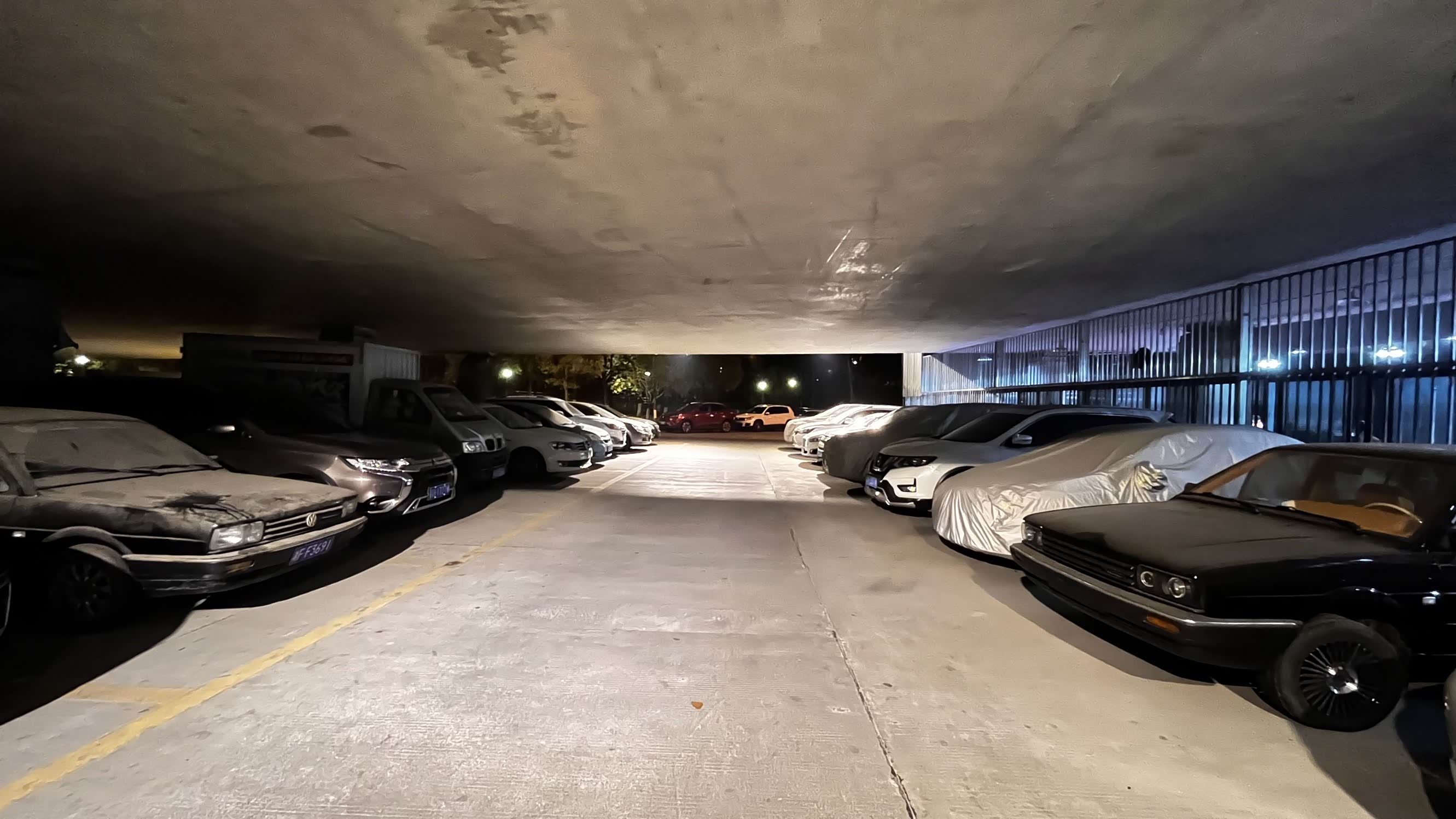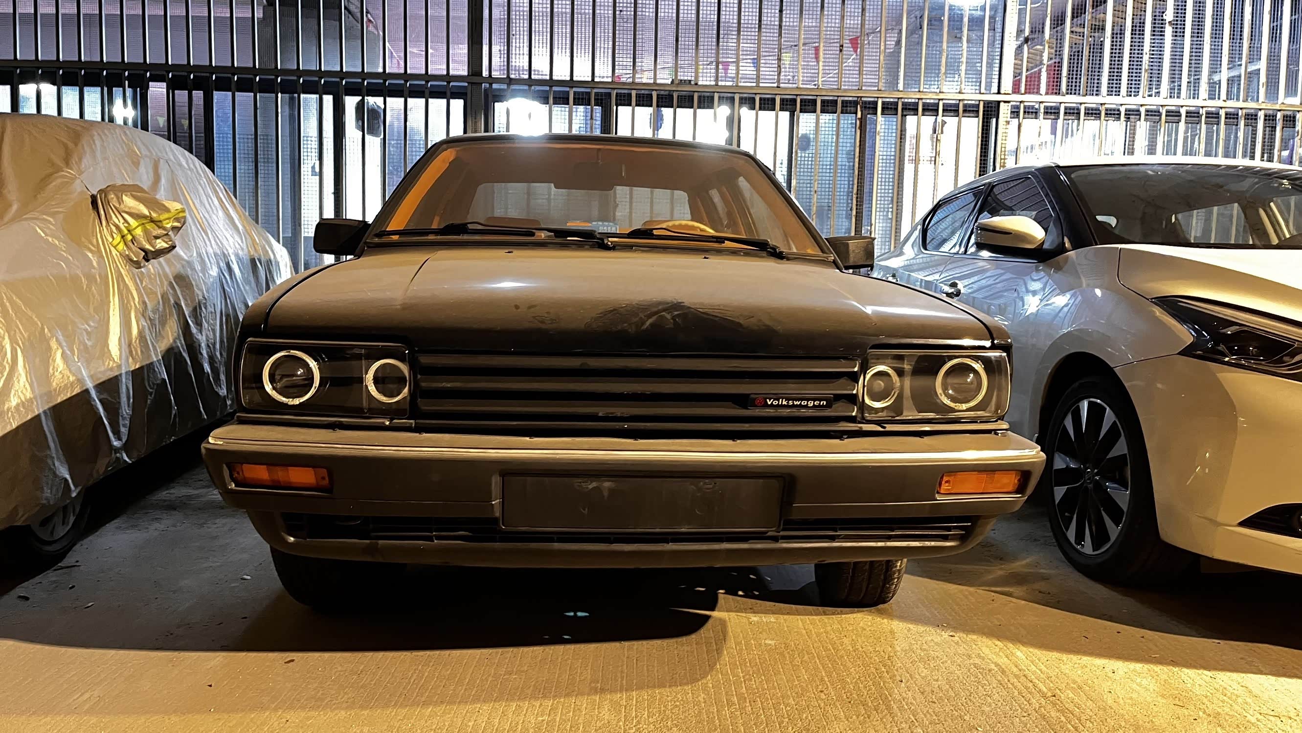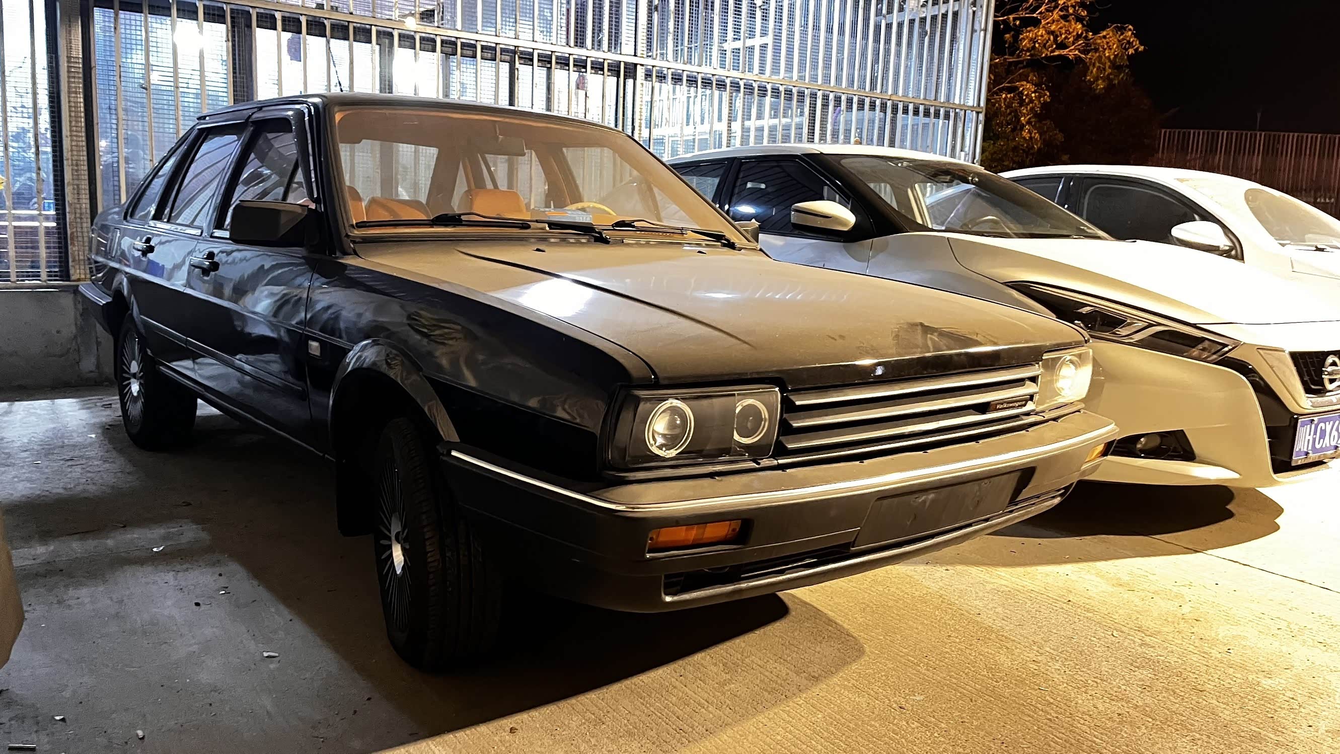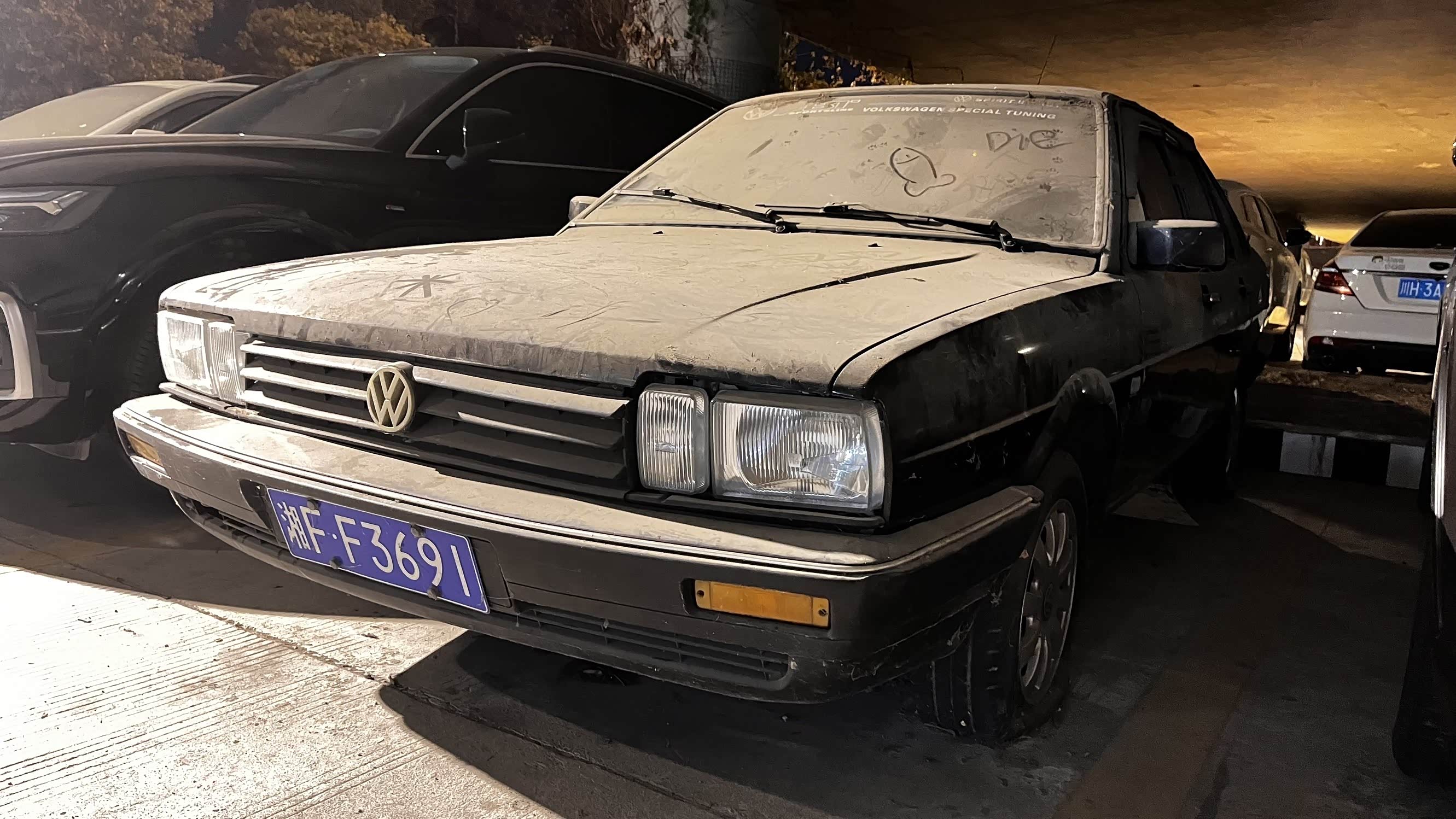 这款车的轮毂是十辐式宽瓣轮条设计,比前一辆更显稳重,辐条上的灰尘虽多,却掩不住金属的厚重质感;我试着轻轻推了推车身,车身纹丝不动,想来底盘和车架依旧扎实。绕到车尾,同样是方正的造型,只是尾灯的灯罩有些泛黄,“上海大众”的标识依稀可见,让人瞬间想起它当年“国民神车”的辉煌。