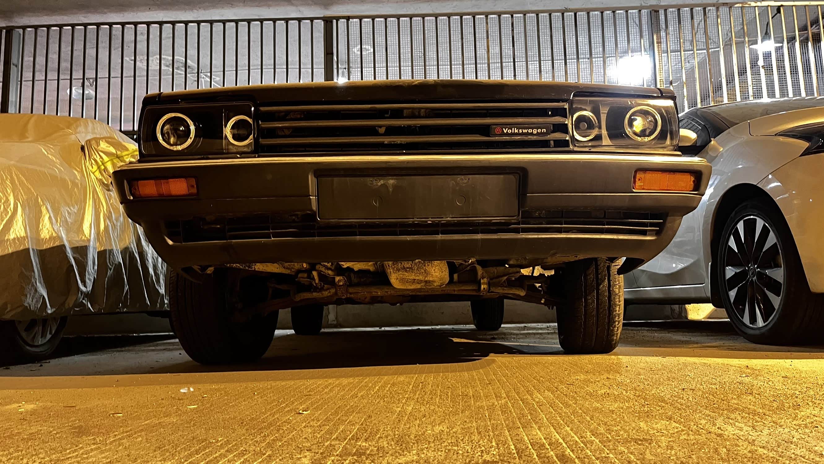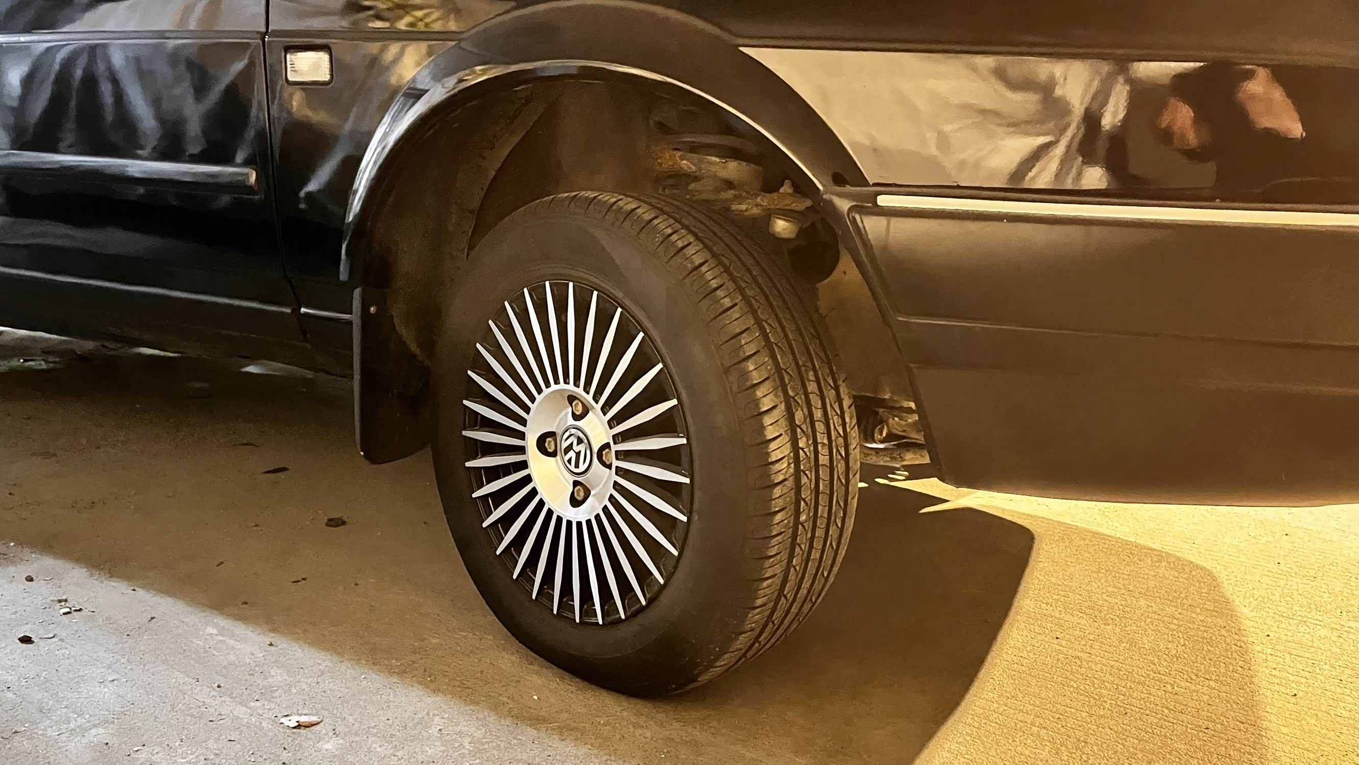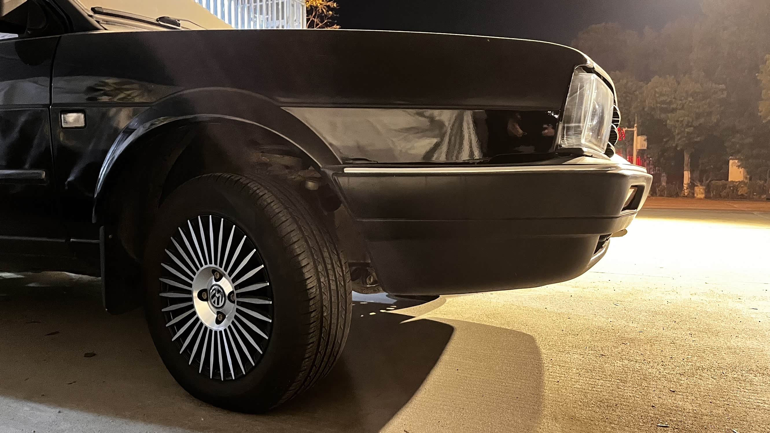 蹲在第一辆桑塔纳旁仔细打量,它没有挂车牌,却难掩岁月沉淀的质感。前脸的格栅左侧嵌着“Santana”英文字母,没有常见的大众VW车标,反而多了几分复古的简洁;大灯是圆润的弧形,像老式相机的镜头,透着温润的光泽;突出的下唇包裹着金属饰边,夜灯光下泛着淡淡的银亮,连细节处都透着当年的精致。最让我眼前一亮的是轮毂,太阳光芒状的辐条向外辐射,金属表面虽有细微划痕,却依旧能看出当年的工艺——这样的设计放在如今的新车上或许不算惊艳,但在老桑塔纳身上,却恰好衬出了那个年代特有的沉稳与大气。
