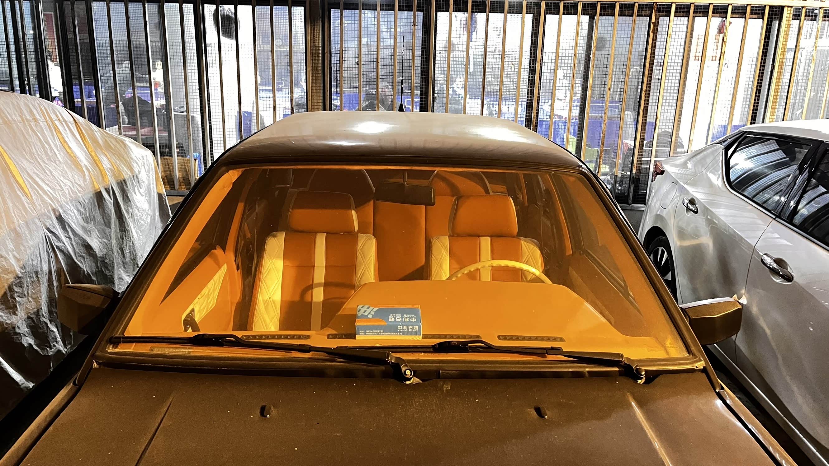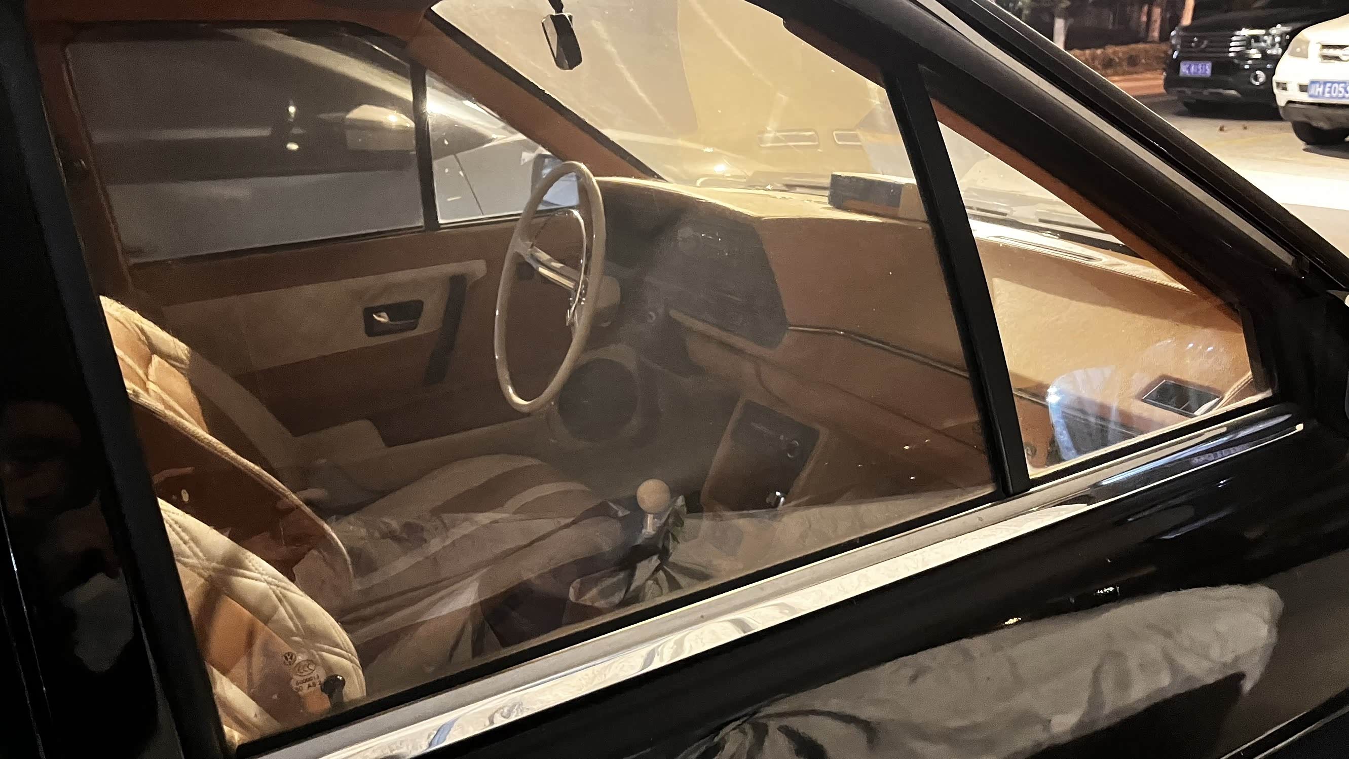 透过暗淡的车玻璃,座舱的简洁更是扑面而来。方向盘是老式的三辐设计,没有复杂的多功能按键,握感扎实却显得有些“空灵单一”,仪表盘是经典的机械指针式,刻度清晰,透着复古的工业风;中控台没有大屏,只有简单的收音机和空调旋钮,按键的阻尼感还很清晰,仿佛能想象到当年车主转动旋钮时的场景。