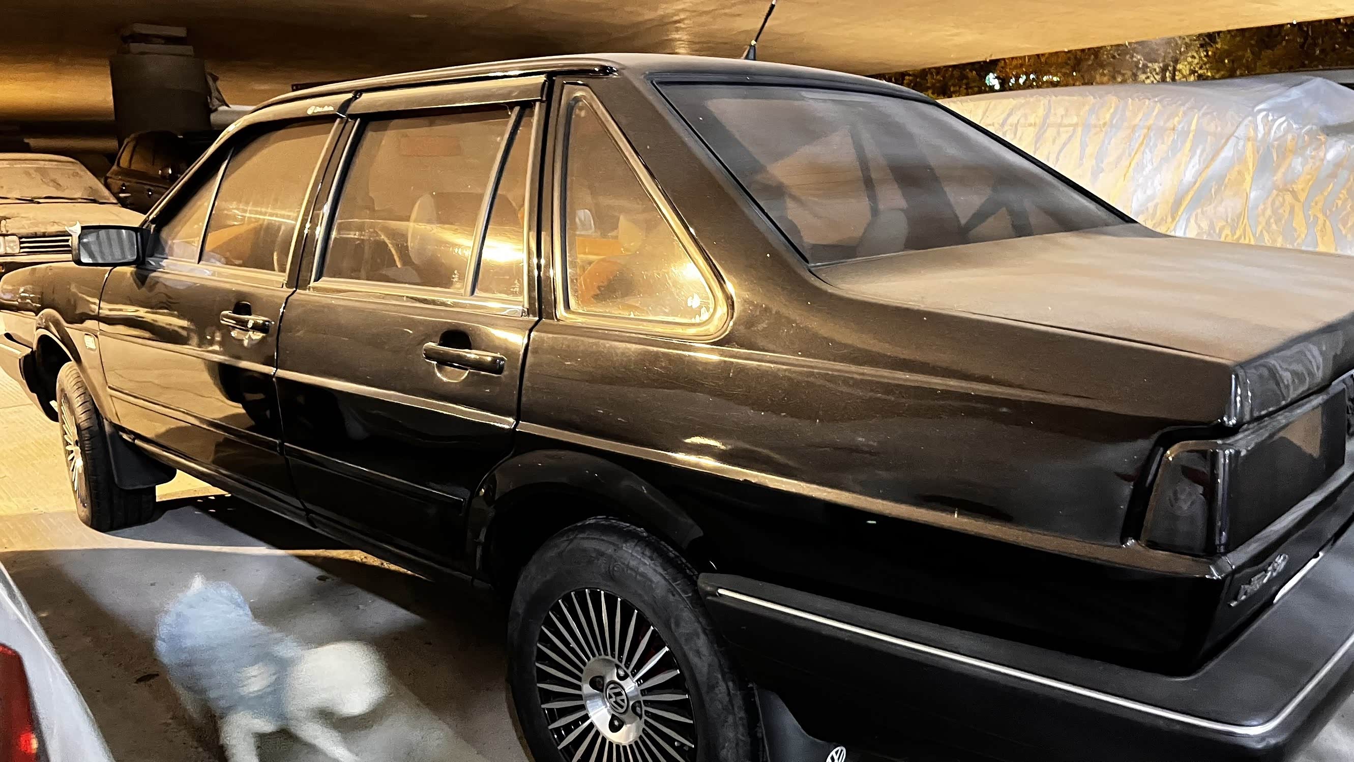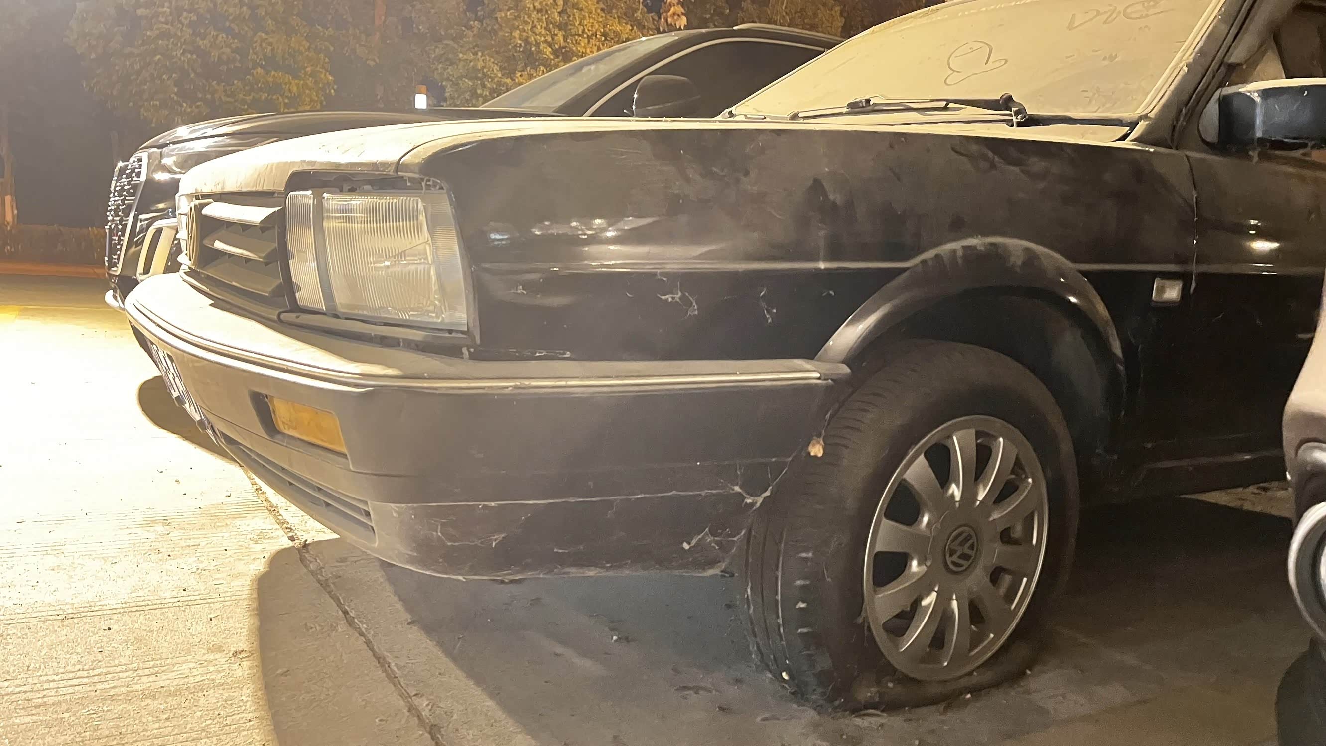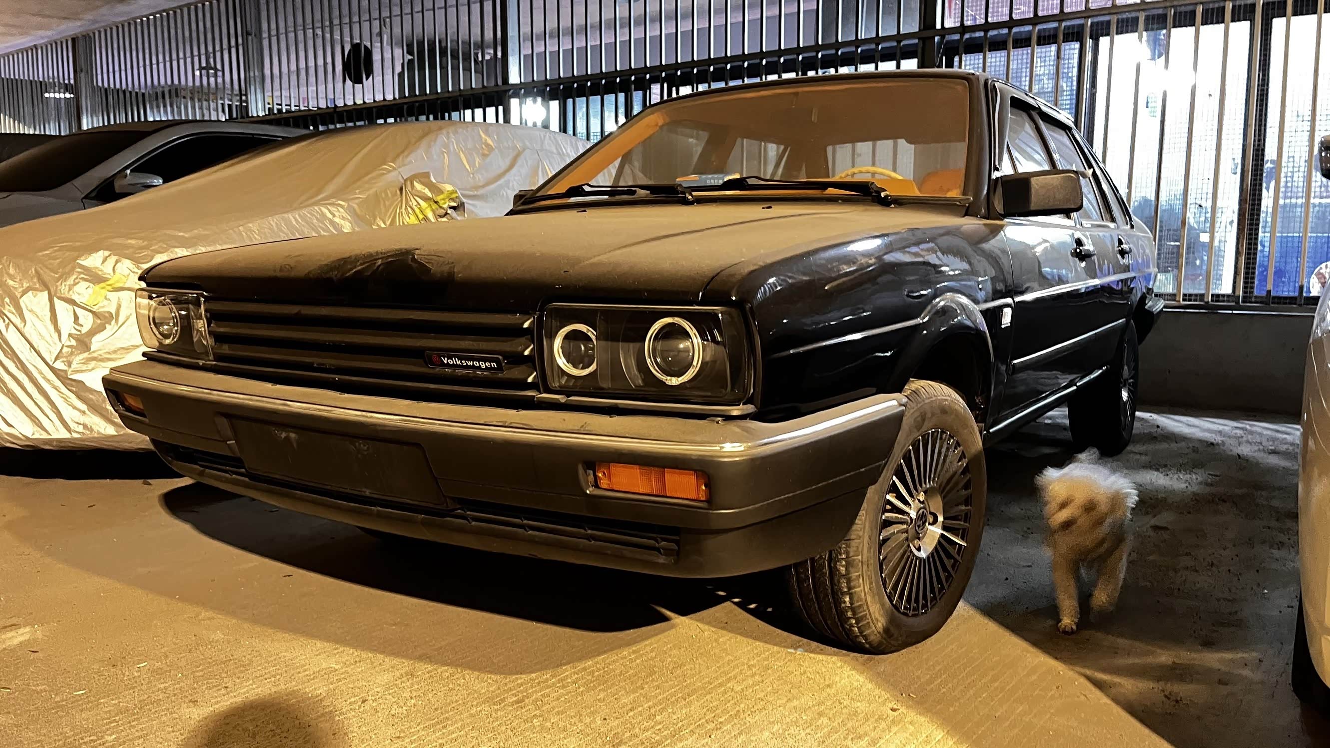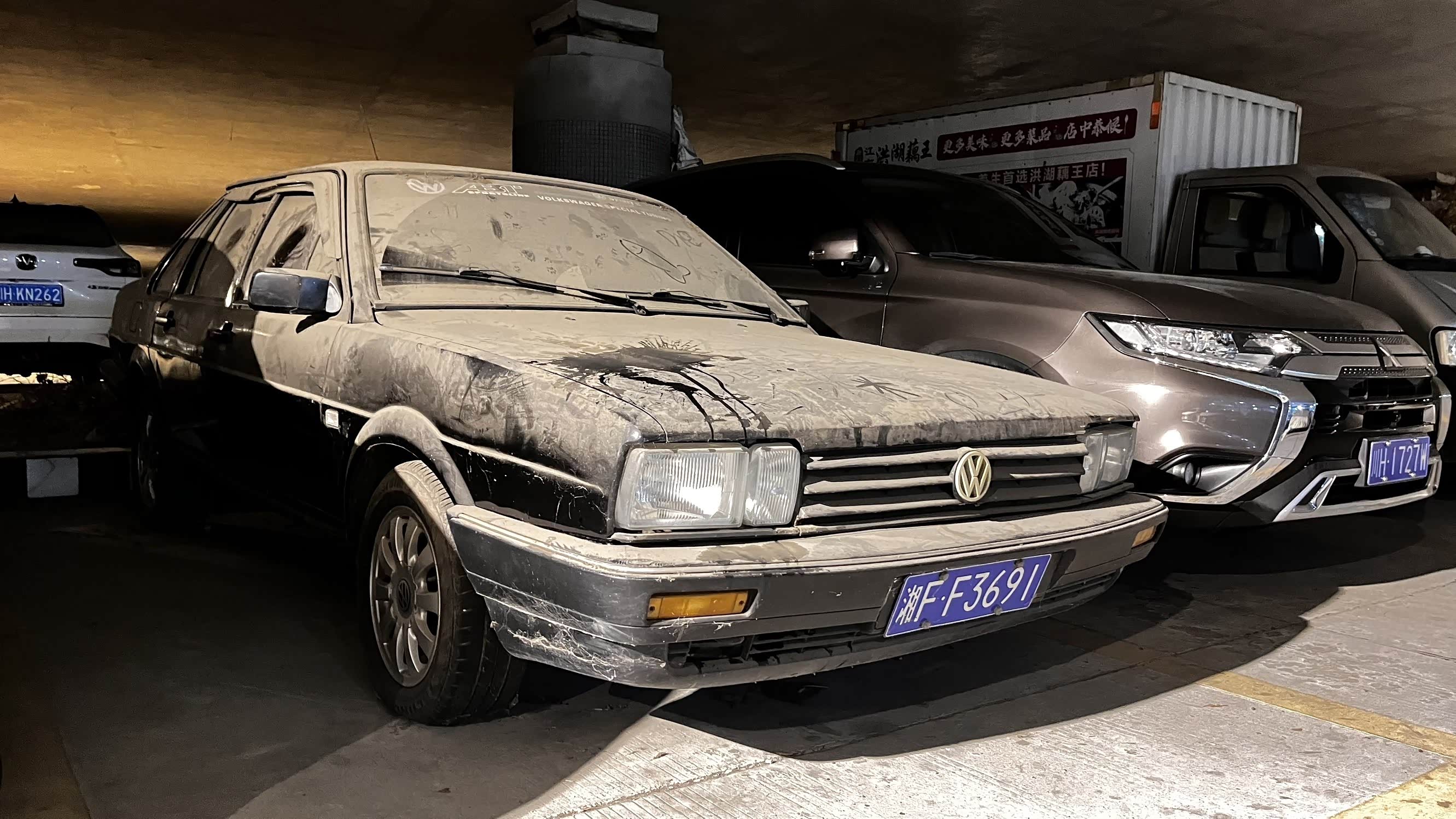 另一辆桑塔纳则多了几分“沧桑感”,车头挂着湘F的蓝色车牌——看牌照应该是来自湖南,不知怎的辗转到了广元的杜里大桥下。它的前脸格栅只有三条横向线条,中间嵌着熟悉的VW车标,只是车标表面蒙了层薄灰,少了几分亮泽;车灯是规整的长方形,与前一辆的弧形大灯形成鲜明对比,透着当年公务车的严谨气质;车身布满了灰尘,车轮旁还落着几片枯叶,看得出来在这里停放了不短的时间,却依旧能看出车身线条的硬朗——老桑塔纳的“皮实”,在它身上体现得淋漓尽致。