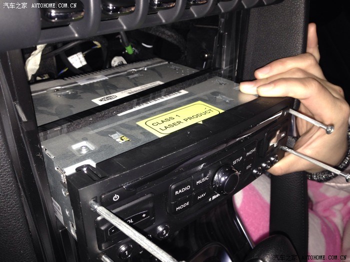 2、用四个硬点的小棍(推荐塑料或者木的)插入机头四个孔内,把插入的部分往内压(就是左边的往右压,右边的往左,因为小棍插入了一部分,具体操作就是把露在外面的往外掰)掰住后伸手从储物盒拆掉后留出的空位把机头往外拉,稍微使劲就出来了。