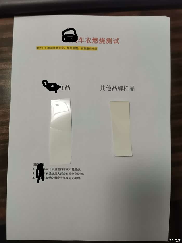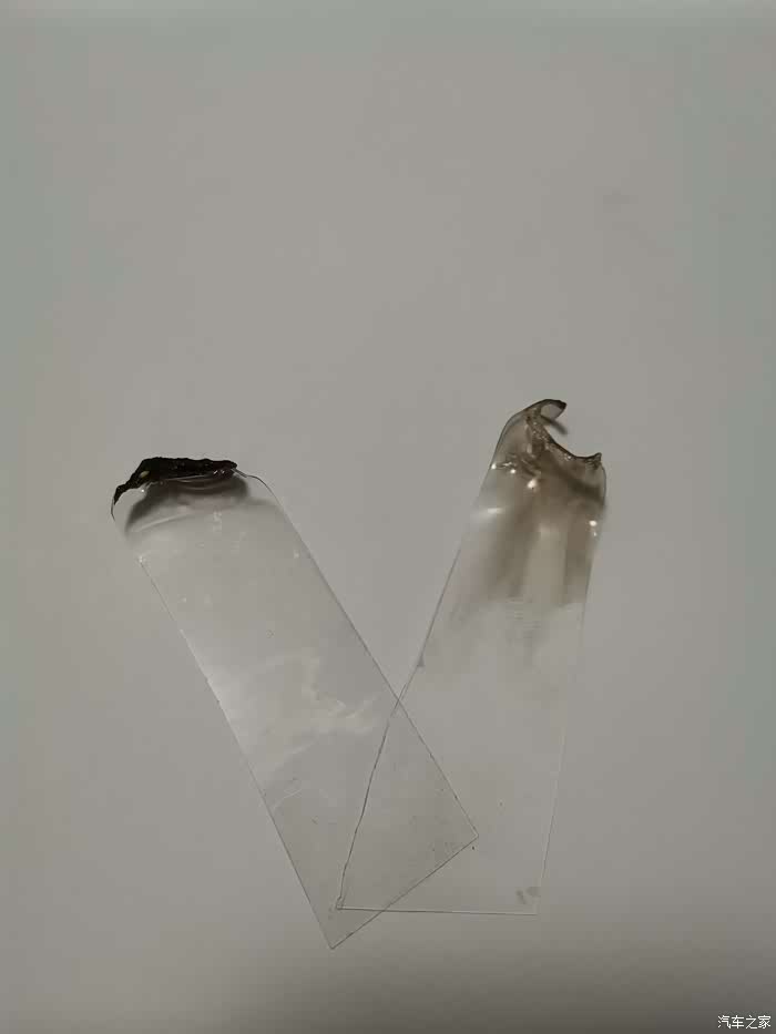 商家提供的燃烧测试,不过这个我感觉效果不是很直观,因为化学成分结构很复杂。不能直接说明质量和品质.这个就是燃烧后的结果,左边的质量不是很好,全部是黑色塑料残留。右边的是我买的车衣,燃烧还是很充分