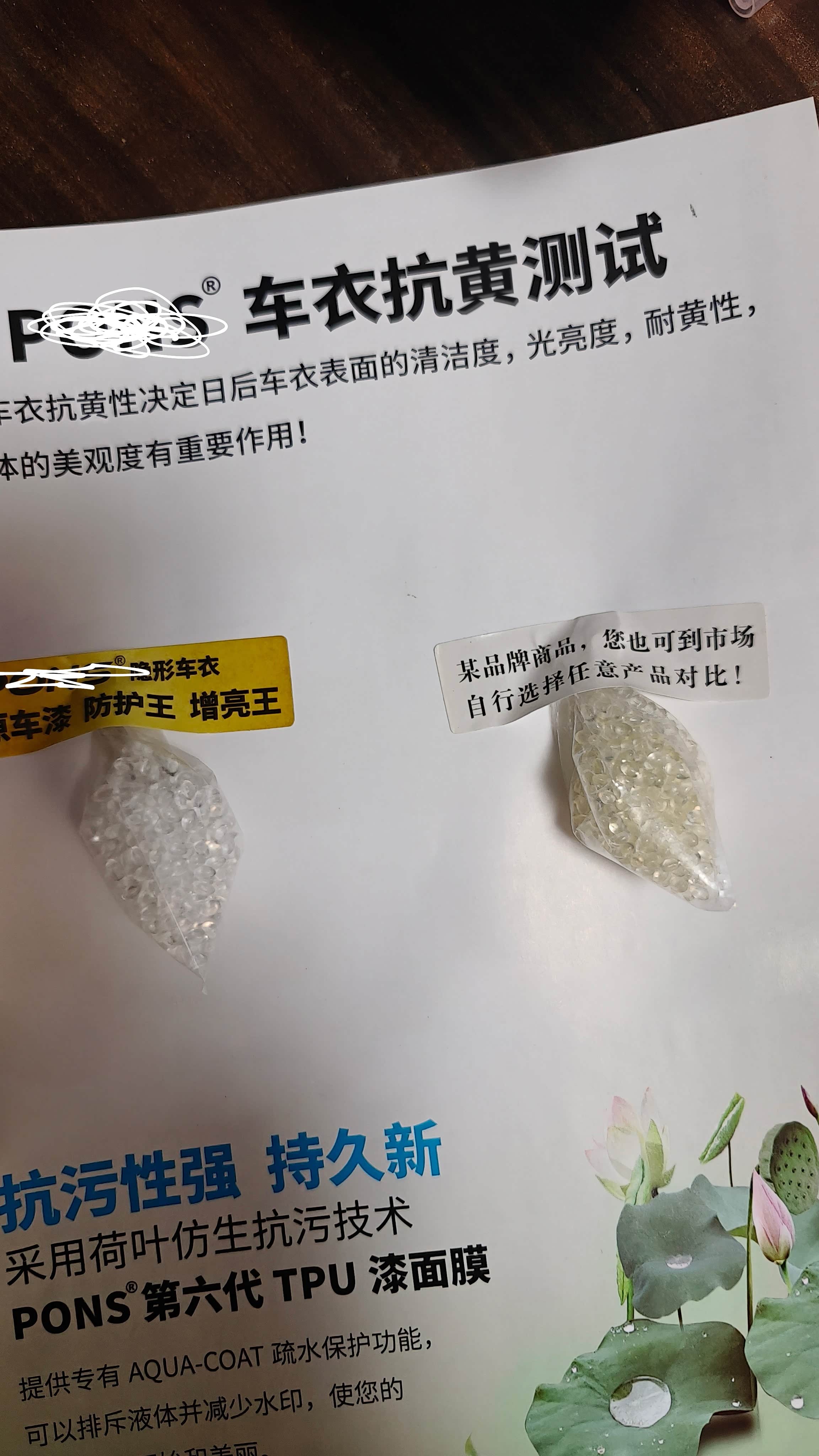 商家提供两种车衣原材料,都是类似塑料小颗粒。商家说这个事在模拟阳光中紫外线照射数千小时的对比结果