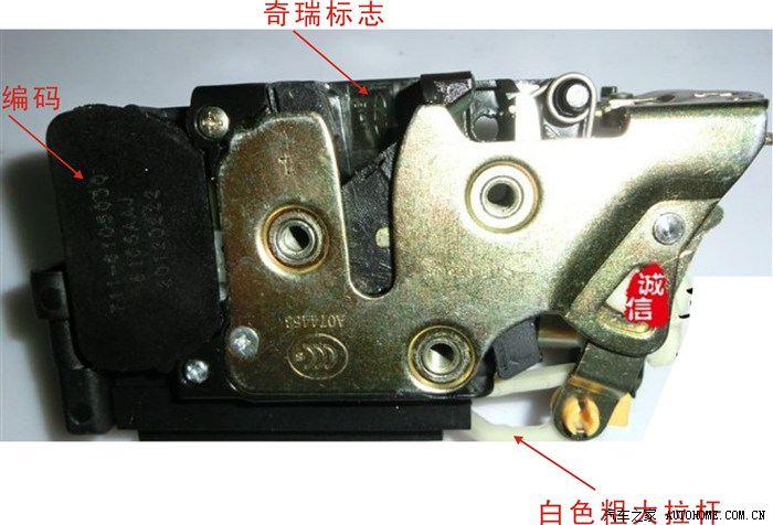,装上不行,一关门就锁,开门也困难,后来换了一个原厂货(其实小飞原厂锁块全是瑞虎的货、锁上有奇瑞标)下面大家看图就明白啦