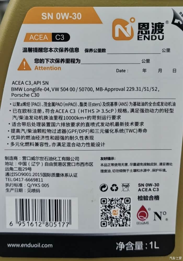 大家好🙂,在机油送检第436篇,检测了恩渡的0W-30 C2,这是一款低粘度、低灰分机油,各项指标很优秀,特别适合带颗粒捕捉器的日韩美系车辆使用,今天再检测一下它的另一款高粘度、低灰分机油,恩渡0W-30 C3,一起看一下是否依旧优秀。