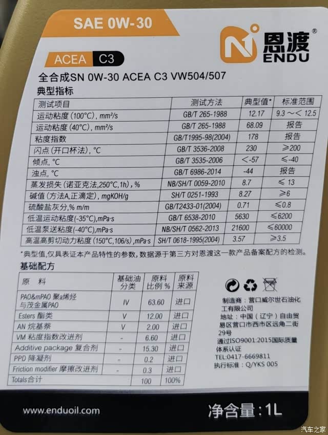 ①恩渡0W-30 C3这款机油,闪点较高,倾点很低,浊点很低,基础油很优秀。