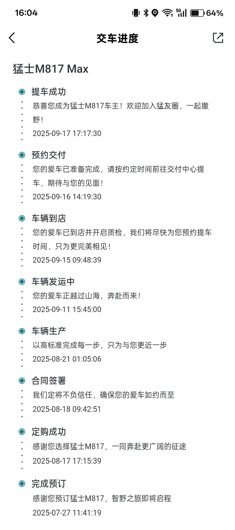 等车的过程是无聊的、焦急的,9月初车友群里其他车友都陆续提车了,我的订单进度没啥动静。中途也无数次***扰销售,要他帮我查进度,幸好销售耐得烦没拉黑我,每次都耐心的帮我查进度