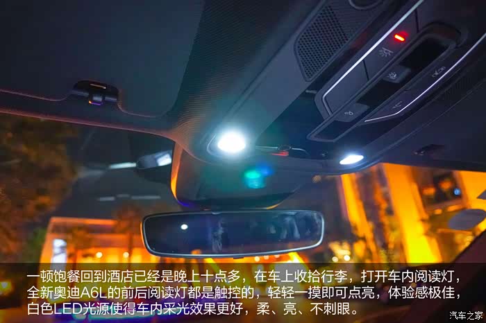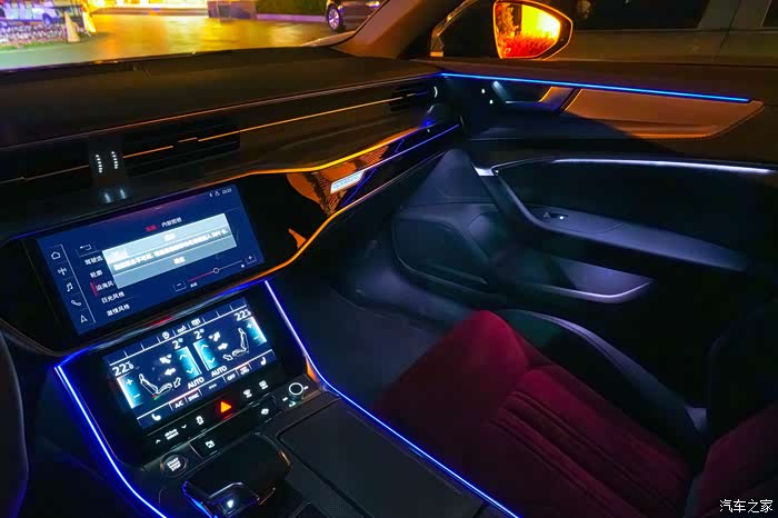 除触摸阅读灯设计,老婆指着前排座椅背面的灯带说,这个地方的灯就只有这一个颜色么?我说那你太小看氛围灯了,全新奥迪A6L车内氛围灯搭载了5种颜色,沿海风格(蓝色)、日光风格(金黄色)、激情风格(红色)、幻想风格(香槟白)、加勒比风格(一种蓝不蓝绿不绿的颜色,很难形容,类似马卡龙蓝。),还可以根据不同需求对车内氛围灯个性化设置。