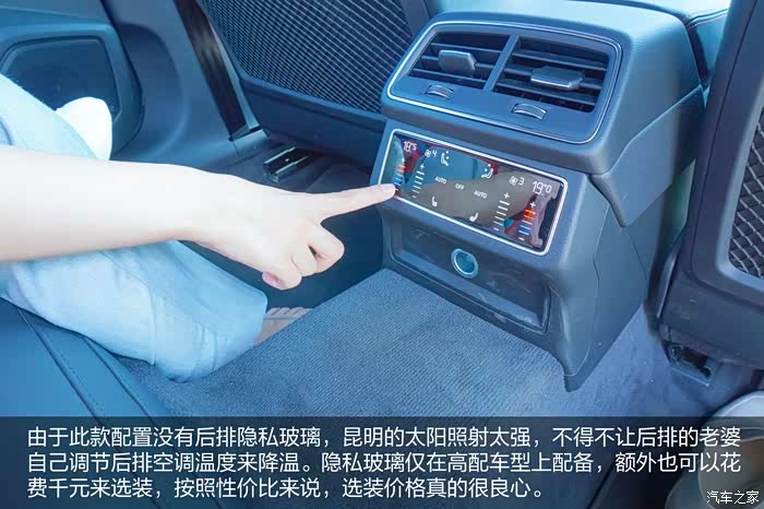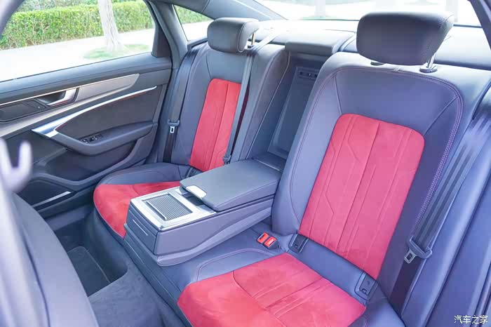 来到后排,空间就不用多说了,我一米八三的个头,膝部空间超两拳,轻松翘起二郎腿。从后排设计上看也非常贴合行政级别轿车的标准。座椅同样采用皮与Alcantara材质。扶手高度与胳膊肘放置高度贴合,舒适度极高。扶手带有杯架与储物格,对于长期乘坐来看,实用性不错。