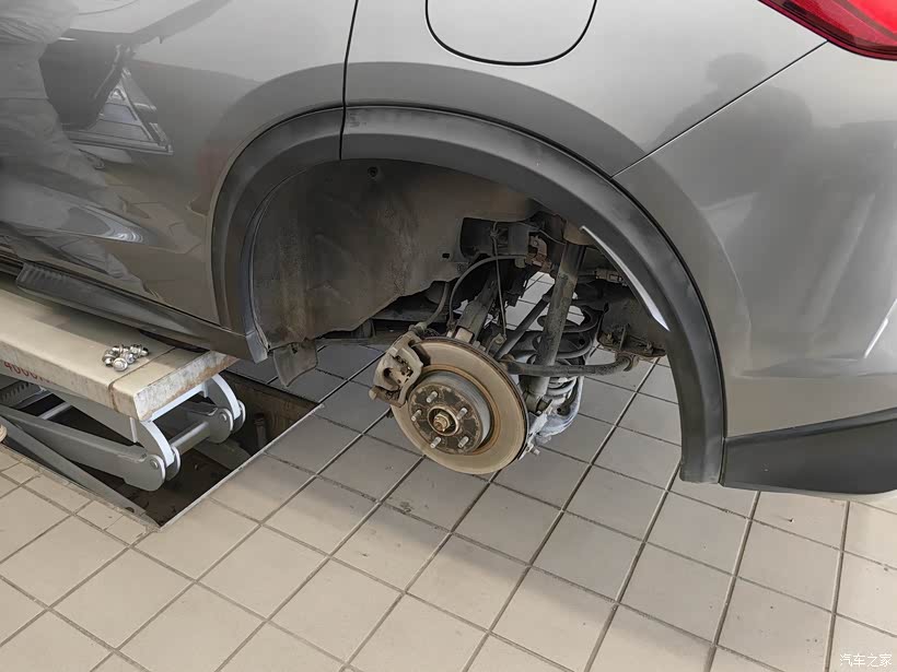 售后的师傅很熟练地拆下车轮。