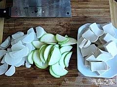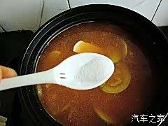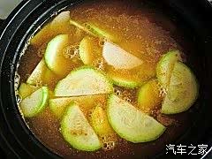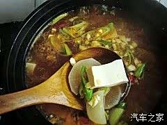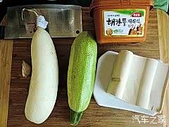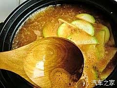 放入石锅中,要先放土豆和排骨这样会好一点,香菇,尖椒;加入一勺大豆酱,喜欢吃辣再放半勺辣椒酱;牛肉粉是必不可少的。之后放入角瓜。炖大概10-15分钟,最后加入一勺泡菜汁,把蒜切末,放入汤中就能喝了!