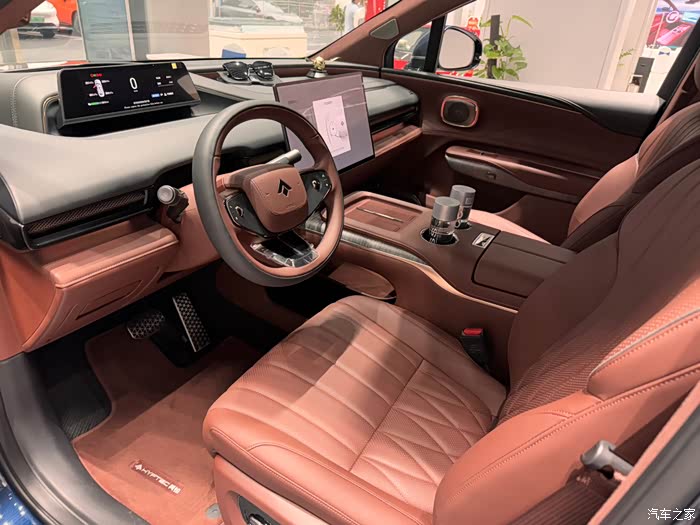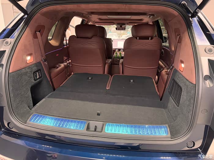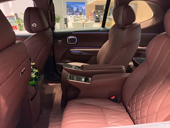 走进内饰就感受到豪华奢侈感,中控台与门板都采用真皮的材质包裹,8.8英寸液晶仪表+17.3英寸的中控显示屏,科技感十足。丁字裤的方向盘摸着很丝滑,T字型的座舱设计,空间也是非常大。中央扶手下方还有一个镂空的储物,中间还可以放两瓶矿泉水,后面还有一个小小的储物箱,因为这个储物箱下方设置一个小小的冰箱。第二排还有17.3英寸液晶屏,座椅还带零重力按摩功能,两个座椅都有的。第三排的座椅还是比较宽敞的,我坐进去都非常的不错,即使平时不用也可以放倒,增加后备箱的空间。