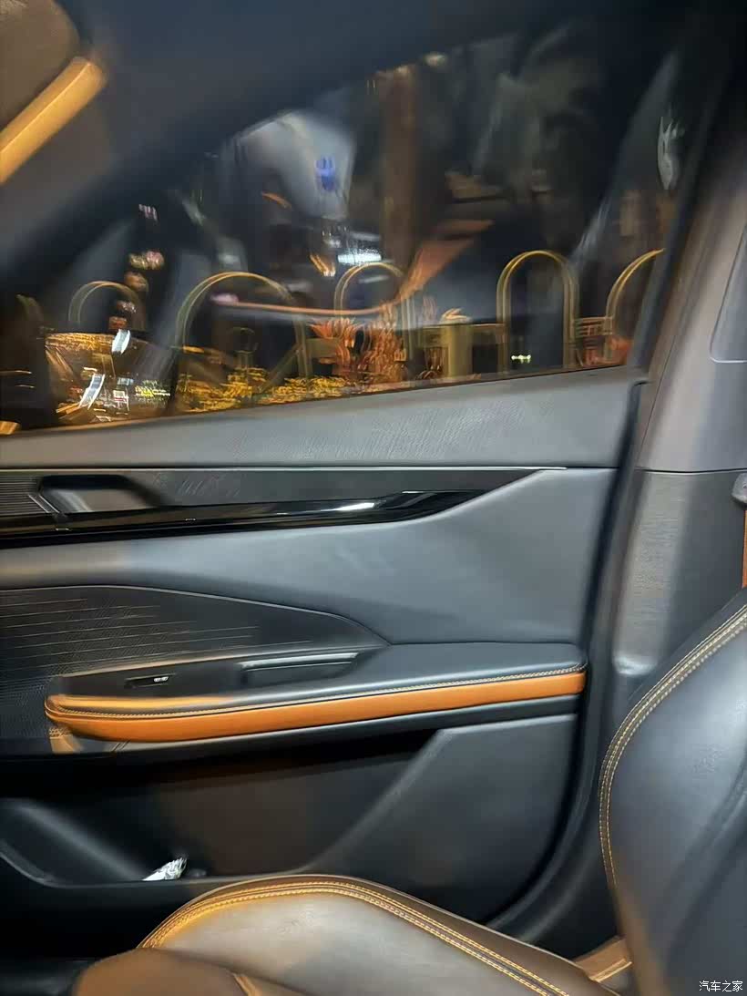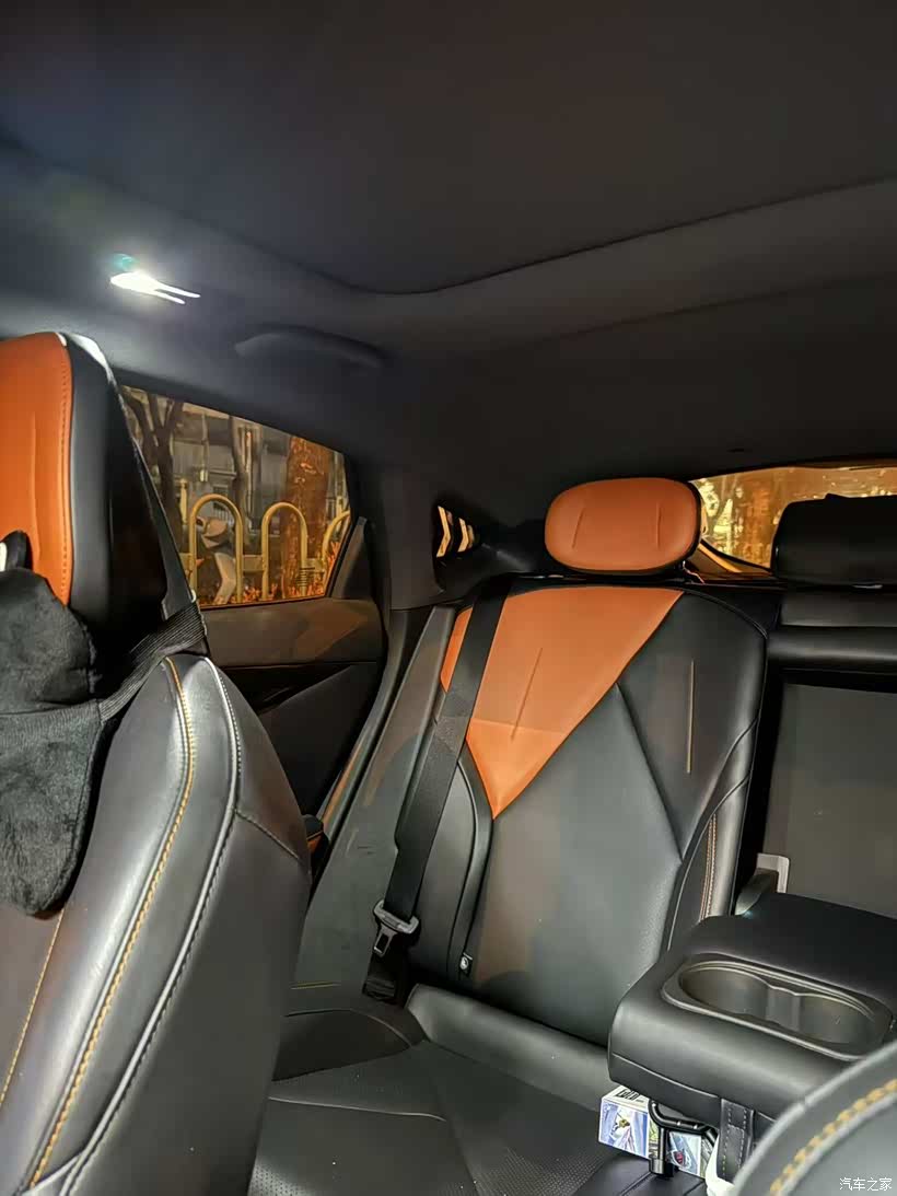 坐进车里感受了一下,内饰的做工比我想象中好。紫色氛围灯挺有感觉的,晚上开车的时候应该挺有氛围。座椅是黑色配橙色的,缝线很精致,摸起来手感也不错。中控大屏尺寸够大,显示的信息清晰直观。