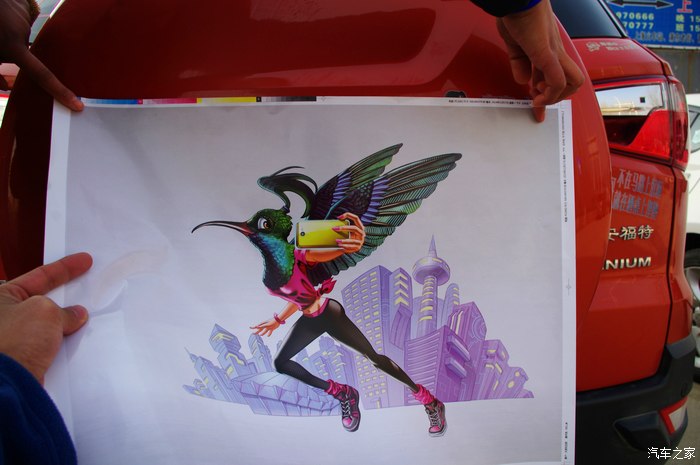 来个特写,虽然字体的底子与车身颜色有所冲突,但是依然不减我们创作的热情。“翼想冒险季,Fun手趣冒险”点明活动主题,“我是蜂鸟丽人”亮出自己的口号,“追求新鲜的路上”表明自己的目标,而“不为取悦别人”则是自己的信条