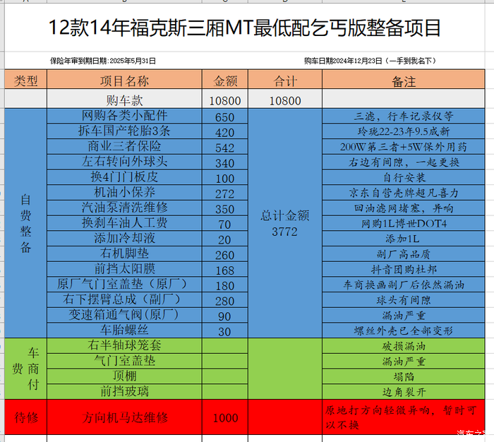 于是想想都叫我修车的同学看过车了,至少都是没出过大事故,发动机没问题的车,于是退而求其次选择了第二台三厢白色手动舒适版,于是第三天下班后和我同事一起过去试驾了一下,当时还发现前挡玻璃有一点裂,让车商换新玻璃,来来回回几次车商才同意。于是签了合同交了2800定金,约定给我整备如下:1、顶棚更换 2、发电机皮带更换、3,更换挡把皮套,4,维修底盘轻微异响 5,气门室盖垫更换(车商说已经换过了还有质保的)6、前挡玻璃更换。座椅前车主包过皮,但是皮板上的那块布没换,松松垮垮很难看,本来也想让车商一起换成皮,车商死活不干。于是罢了。车商两天就说全部已经弄好了,第三天 2024年12月23日过完户叫我过去拿车,于是兴冲冲的跑过去交了剩余尾款,直接去车管所车辆过户区拿车,吐槽一下尼玛这车商具然车都不给我洗一下就交车给我。