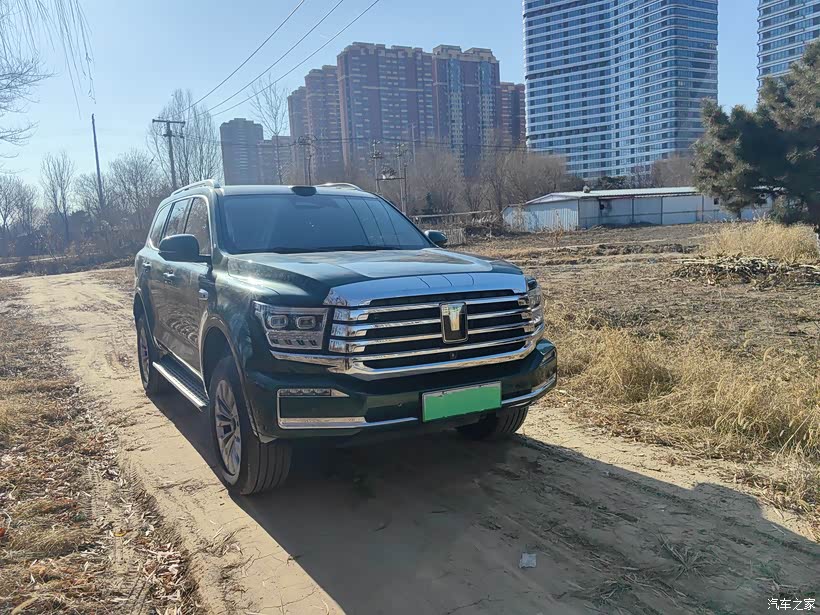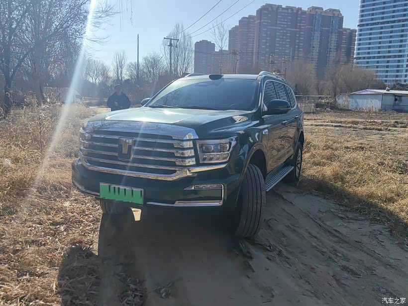 停路边拍了张全景,这墨绿色在荒地里还挺扎眼,太阳一照漆面锃亮,别看路糙,车往这儿一停还挺有那 “野劲儿”,旁边的高楼当背景,有种 “城市边缘撒野” 的反差感。