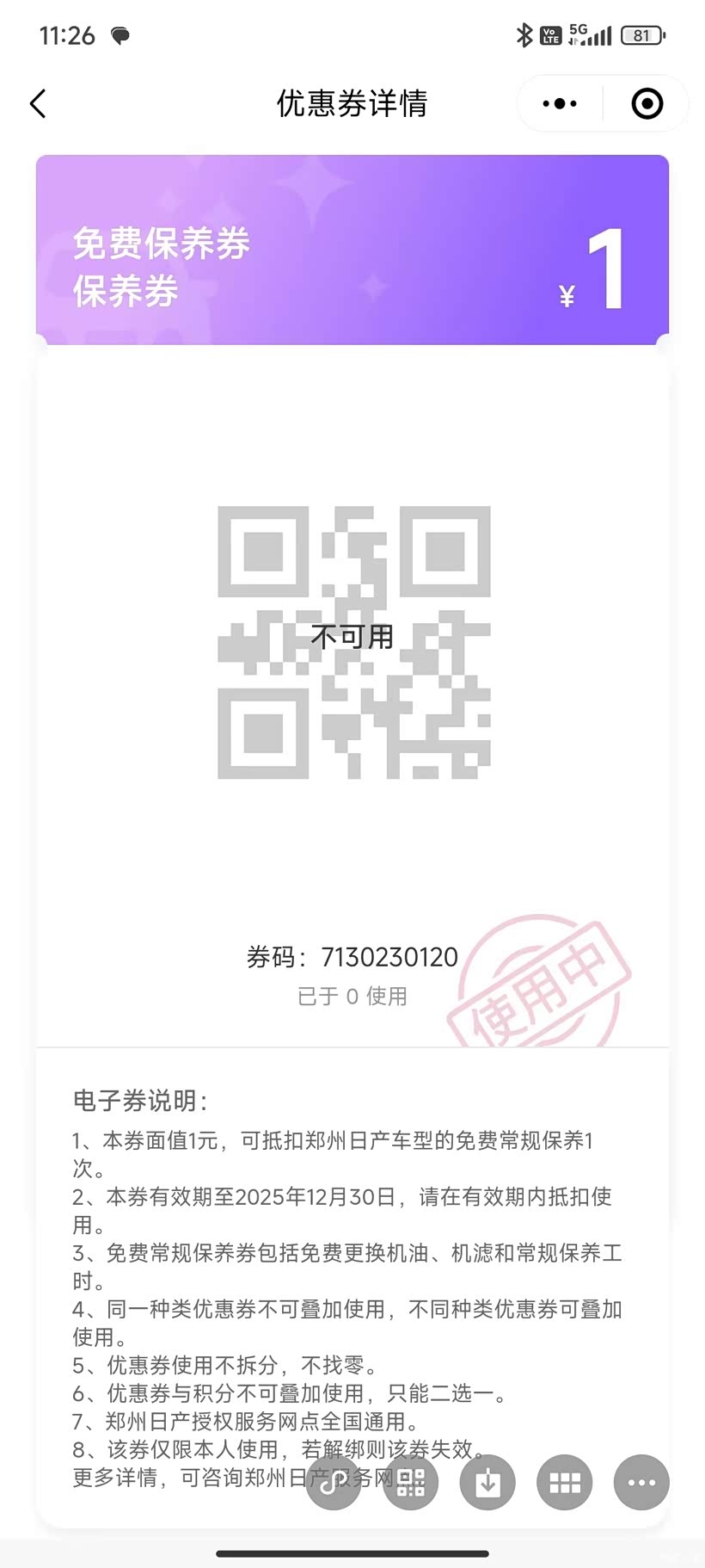 第一眼看到1元保养券,还以为是只优惠一元,结果是保养费只花一元