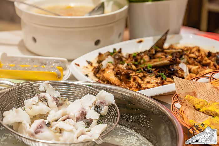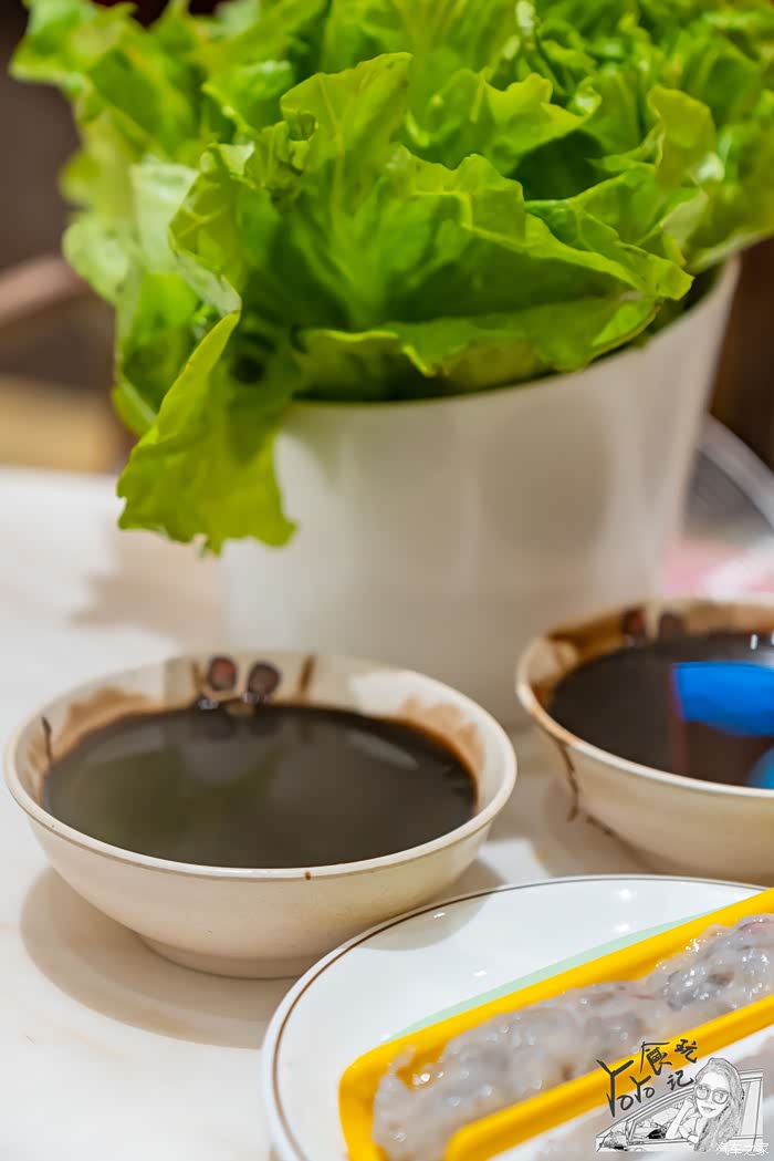 坐下后,服务员就给我们上了清水汤底,虾滑,生菜以及龟苓膏。