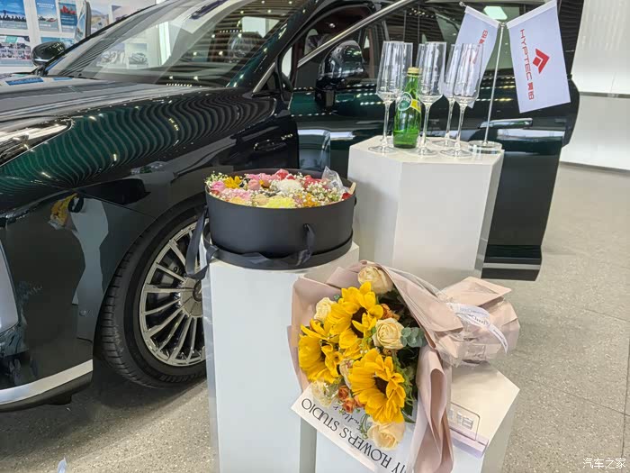 检查完毕,交付区灯光渐暗,幕布缓缓拉开,我们的昊铂HL在聚光灯下熠熠生辉。车身侧面系着红色绸带,车顶洒满玫瑰花瓣,前挡风玻璃上用金粉写着“欢迎回家”。交付专员捧来一束白玫瑰与满天星搭配的鲜花,以及装满阳光玫瑰青提、车厘子的水晶果盘 。