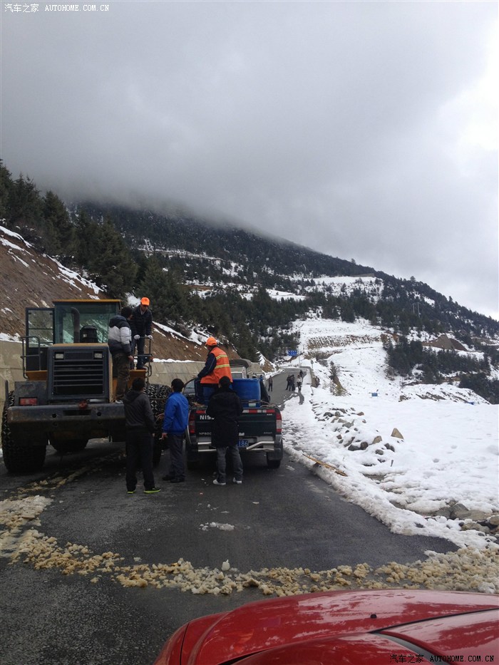 我们准备翻越第一座雪山,路上大铲车加油把道路双向都堵住了
