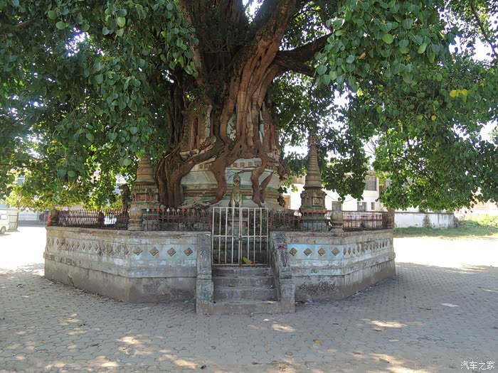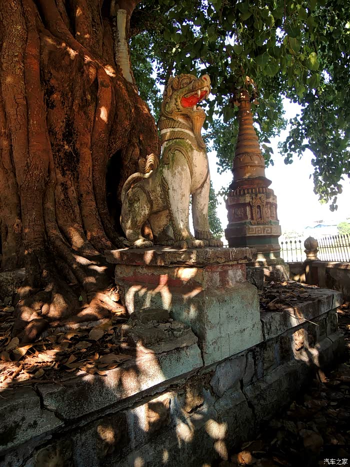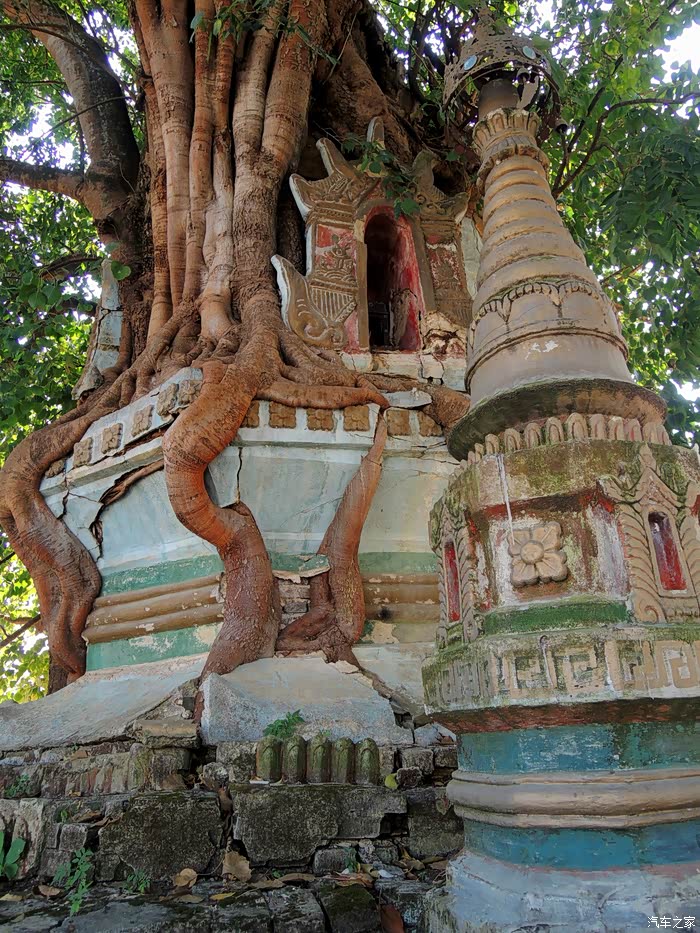 农贸市场转完,买了好些东西,走了、去下个景点“树包塔” 树包塔位于芒市步行街中段,距今已200多年历史,被傣家人视为“爱情塔树包塔又因建在昔日的姐列寨,故傣语称“广母姐列”,汉译“铁城佛塔”,史传芒市第十五世土司方作藩就职期间(1741—1770)为了纪念一场打胜的战争而建,之后姐列寨又毁于战乱,约百余年前,塔缝中长了一株菩提树,几度风雨,盘根错结的树根逐渐将塔缠绕包裹,便形成了今日的树包塔。