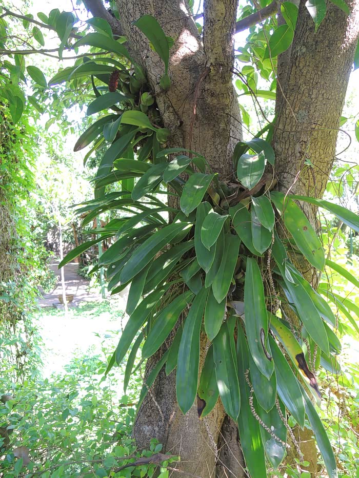 该树主干中部平生的众多气生根,顺树而下,相互交缠,盘于根部。左右两侧的主枝上,有32条大小不等的气生根垂直而下,扎入泥土,形成根部相连的丛生状支柱根,塑造出一树多干的成林景致。