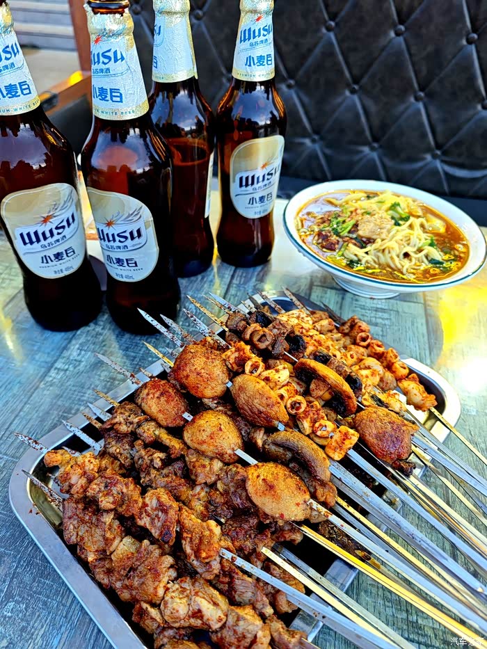 由于大家都不想在城市里花时间,所以接上朋友之后我们就继续出发前往奇台县休息。一路上朋友开始研究起极石01,朋友家里是一辆蔚来ES6一辆沃尔沃XC60,对极石01的车内空间表现还是非常满意的,前两排4个人每个人都能找到自己舒服的座椅模式,一二排座椅同时都有按摩功能,打开按摩一后一路轻轻松松的来到了奇台县品尝奇台县最出名的黄面加烤肉。