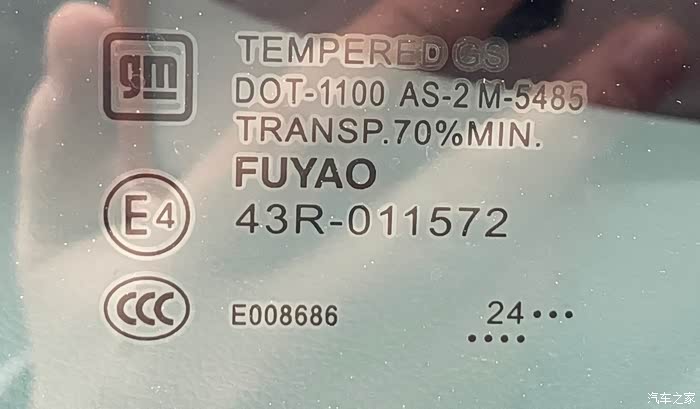 E4 43R - 011572:E4是欧盟认证标志,43R是欧盟关于汽车玻璃的法规标准,011572是认证代码。